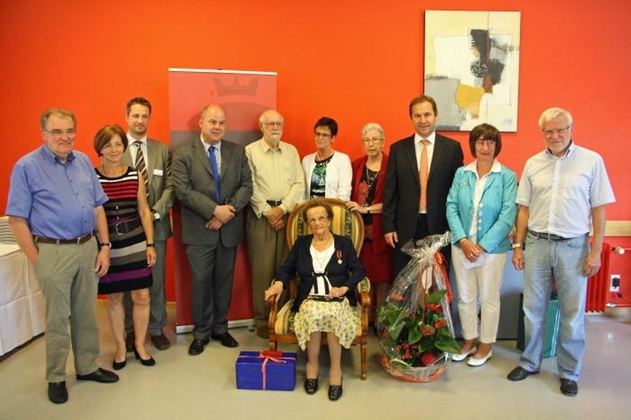 Als erster Gratulant erschien Familienminister Marc Spautz, der die Jubilarin mit dem Verdienstkreuz der Regierung auszeichnete, ein Präsent der großherzoglichen Familie überreichte und Parallelen zwischen „Käerjeng“ und „Boufferdeng“ zog. Sohn Jos Reinert dankte im Namen seiner Mutter dem gesamten Personal des Cipa, besonders aber Schwester Agnès und Camilla Clees.