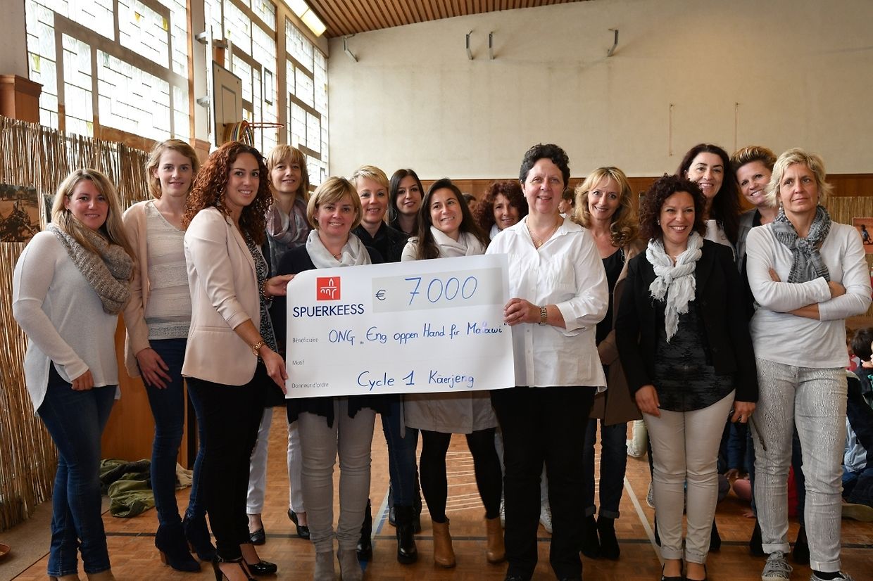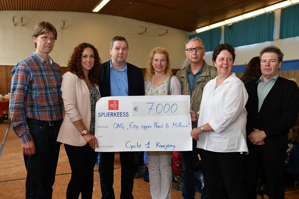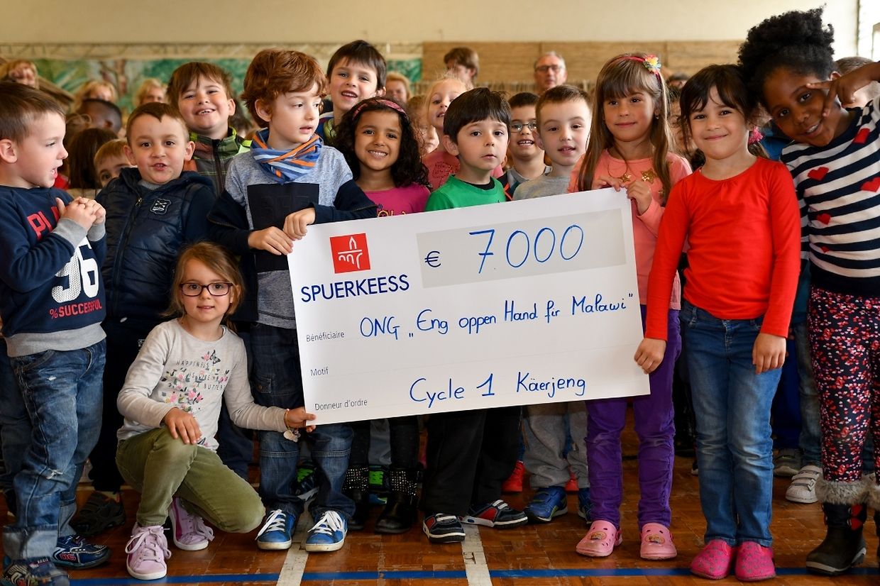 Am 24. Mai 2016 überreichten die Vorschulkinder mit ihren Lehrerinnen der Vereinigung „Eng oppen Hand fir Malawi“ einen Scheck von 7.000 Euro. Es ist dies der Erlös des Verkaufs von Bastelartikeln und der Bildergeschichte „Nubia“, welche anlässlich des Tages der offenen Tür am 29. April verkauft wurden. „Nubia“ ist eine selbst geschriebene und illustrierte Geschichte der Vorschulkinder.
