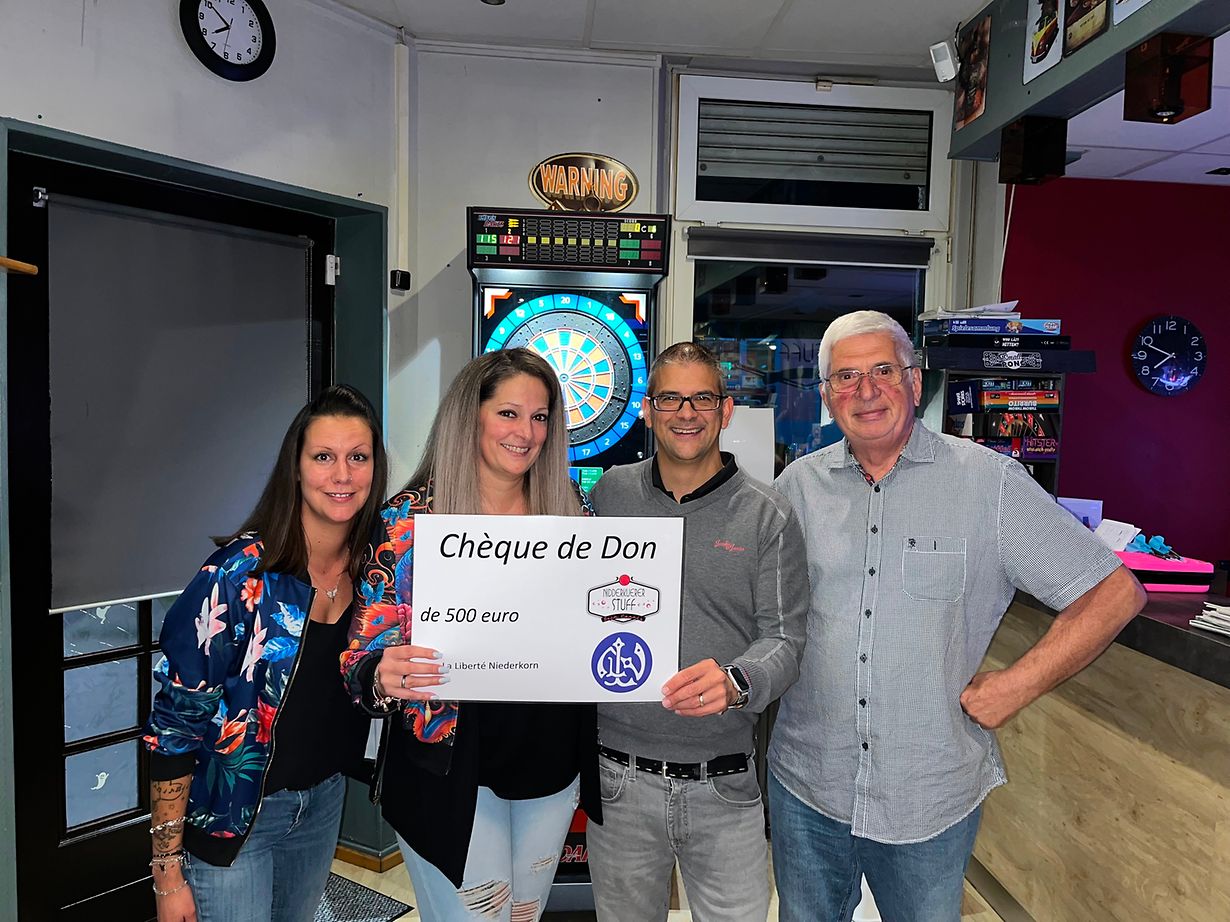 Niederkorn. Bei einer kleinen Feierstunde nahm der Turnverein La Liberté einen Spendenscheck über 500 Euro von Carole Rennel, Inhaberin der Gaststätte "Nidderkuerer Stuff", entgegen. Das Geld stammt aus dem Erlös des diesjährigen Fastnachsballs „Alles am Gelli“. Präsident Claude Bariviera und Schatzmeister Claude Barnich bedankten sich im Namen aller Aktiven herzlich für diese noble Geste und die hervorragende Zusammenarbeit. Der Breitensport liegt dem Verein seit seiner Gründung 1906 besonders am Herzen. Viele Kinder, Jugendliche und Senioren sind im Verein aktiv. Schließlich ist Sport ein wichtiger Schlüssel für körperliche und geistige Leistungsfähigkeit, für Integration und soziale Kontakte und steht darüber hinaus für eine hohe Freizeitqualität. Die Spende helfe, diese wichtigen Aufgaben zu unterstützen, erklärte Präsident Claude Bariviera und wies bereits auf die nächsten Veranstaltungen des Vereins hin. Am 29. März 2025 ist bereits eine Neuauflage geplant: Dann heißt es mitten in der Fastenzeit zum 90. Mal „Vive de Gelli“.