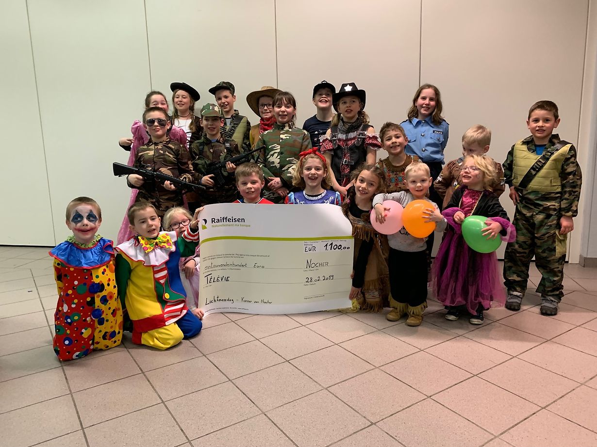 Nacher. Och dest Joer sin d‘Kanner aus dem Duerf rem liichten gaang an sin mat vill Freed an bei guddem Wieder vun Haus zu Haus gezunn. Dobäi hun si Séissegkeeten an awer och Suen gesammelt. Stolz kennen si lo um Televie-Dag am Kiischpelt een Scheck vun 1100.- iwerreechen.