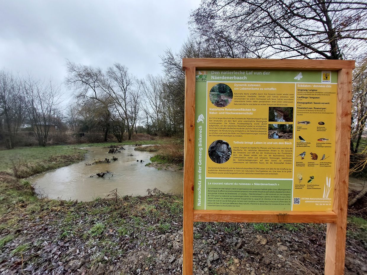Ein 135 Meter langer Abschnitt des Flussbetts der Näerdenerbaach wurde renaturiert, um dem Bach die ursprüngliche Morphologie zurückzugeben. Die frühere Flussbegradigung wurde gezielt aufgehoben, um den natürlichen Wasserlauf wieder zu ermöglichen. Durch das Schlängeln des Baches wurde der Lauf von 140 Meter auf 200 Meter verlängert. Die Renaturierung ermöglicht es die Retentionskapazität zu erhöhen und somit das Risiko von Überschwemmungen bei Starkregen zu mindern.