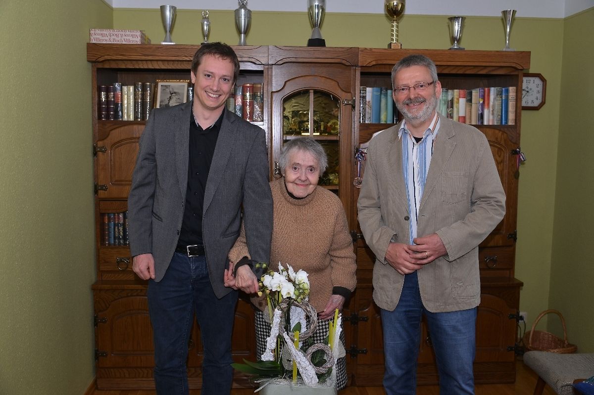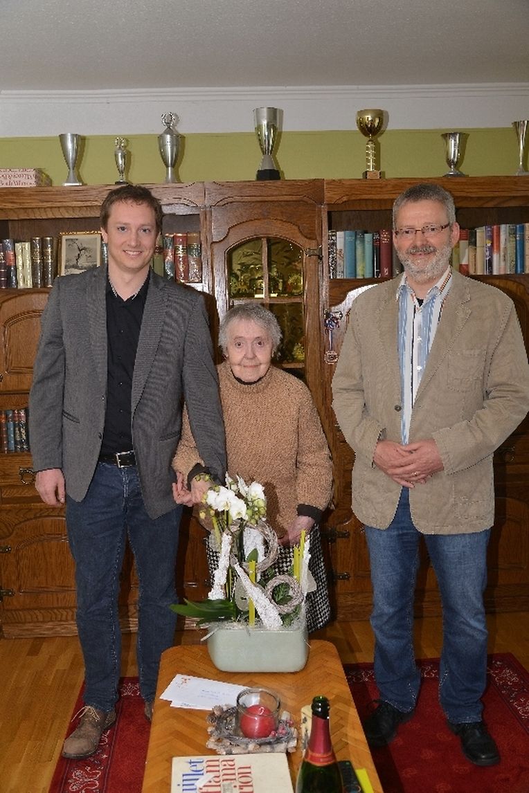 Nördingen: Bürgermeister Thierry Lagoda in Gegenwart von Schöffe Marco Fassbinder waren neulich bei Elise Lorenzoni- Kemp nach Nördingen mit einem Präsentkorb und Pralinen erschienen, um der Jubilarin zum 85. Geburtstag die Glückwünsche aller Einwohner aus der Gemeinde Beckerich übermitteln zu dürfen. Als jüngste Tochter von drei Kindern der Eheleute Dominque Kemp und Louise Gries, erblickte Elise Kemp das Licht der Welt am 8. April 1932 in Rodange. In ihrer Jugendzeit war die Jubilarin während zehn Jahren in der Rezeption vom Hôtel de Paris in Luxemburg beschäftigt. Nach der Heirat am 14. November 1964 mit Oliveiro Lorenzoni aus Santa Sofia (I), der sein tägliches Brot bei Arbed Rodange und später im Stahlwerk in Schifflingen verdiente, wohnte das Paar mit ihren zwei Söhnen in Lamadelaine. In Zwischenzeit hat sich die Familie um zwei Enkelkinder vergrößert. Seit Januar 2002 ist Elise Lorenzoni- Kemp verwitwet und lebt nun allein in Nördingen. Ihr Freizeit genießt die Jubilarin und treue Luxemburger Wort- Leserin ihre Freizeit an vier Tagen in der Woche im Foyer des „ home pour personnes agées“ in Redingen/ Attert wo sie sich auch sehr wohl fühlt. Für die schöne Geburtstagsüberraschung bedankte sich die Geehrte bei der Gemeindeverwaltung aber ganz besonders.(TEXT/FOTOI: CHARLES REISER)