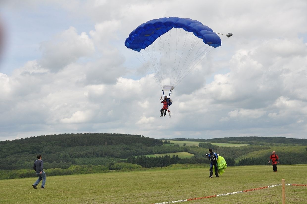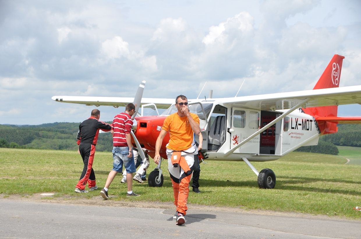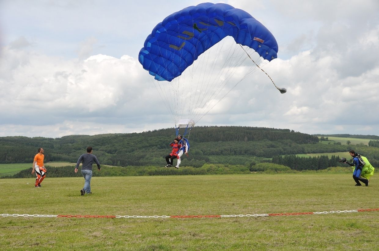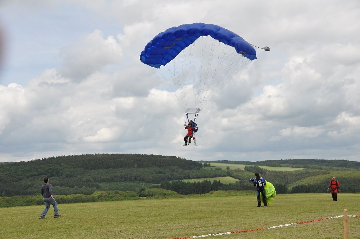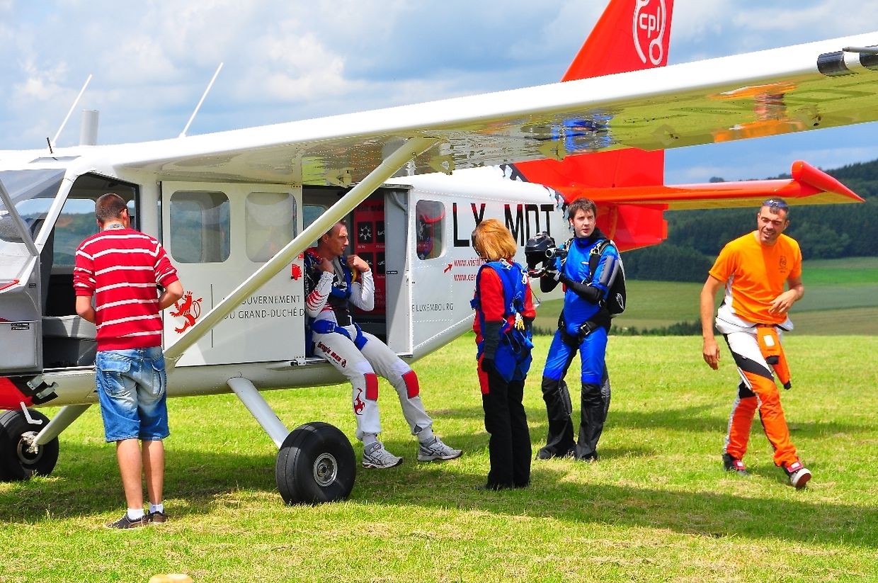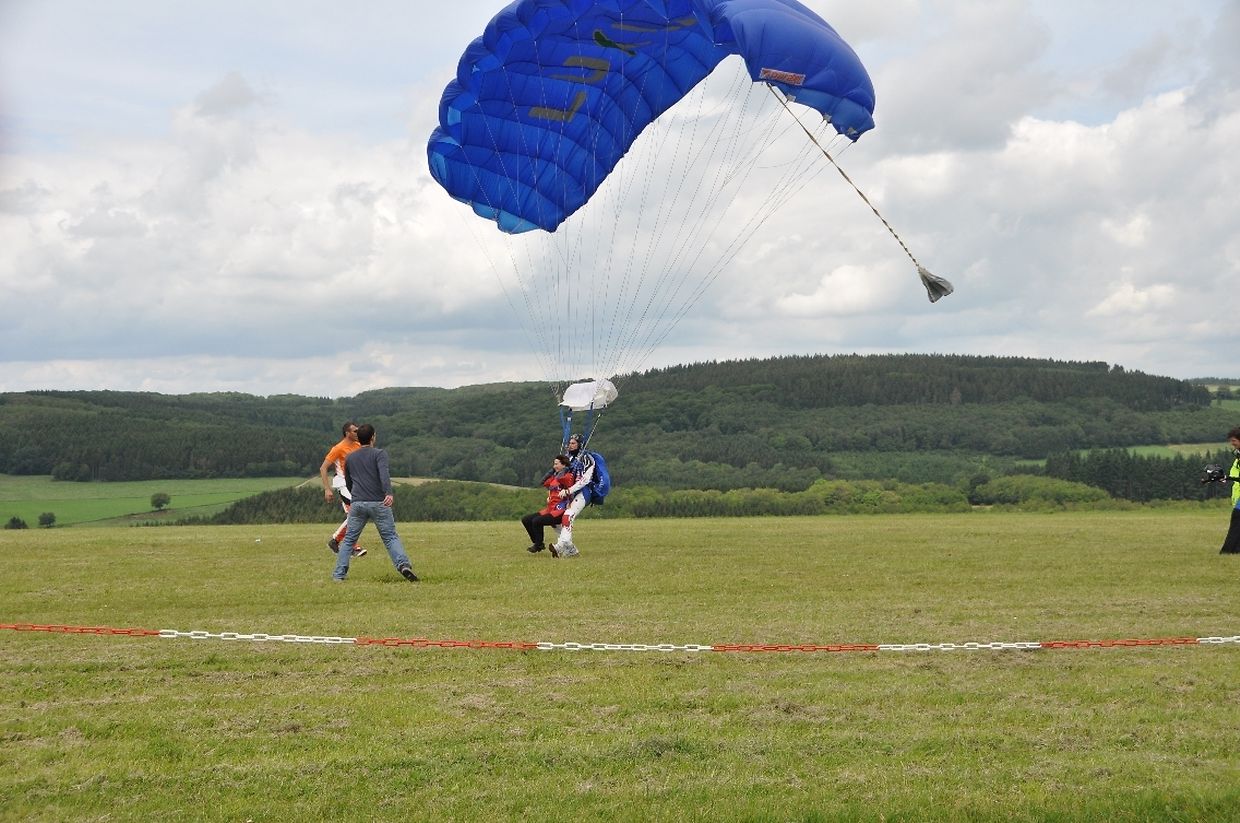 Eng feieren um Buedem die aner loossen sech vum Himmel falen.Aus 4000 mtr héicht sin se gesprong,enzel an am Tandem.Et ass schon interssant ze gesin wéi déi vum Cercle Para Letzebuerg gewessenhaft hir Fallschirmer an dat wat se undin preparéieren dat se och ganz ennen ukommen.Eng kleng Fotogallerie hun ech ennen zesummen gestallt.