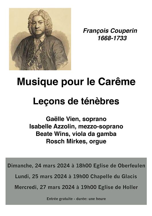 Oberfeulen Fastenzeit Konzert Leçons de ténèbres Francis Henrotte Veröffentlicht am Montag, 26. Februar 2024 um 12:17 Oberfeulen Feulen, Luxemburg Musique de François Couperin pour le Carême "Leçons de ténèbres" Dimanche le 24 mars 2024 à 18.00 heures à l'Eglise d'Oberfeulen Unpassenden Inhalt angeben Weitere Neuigkeiten von Francis Henrotte > Gesang und Orgelkonzert in Oberfeulen mit Les Enchantées und Jos. Majerus 05.10.25 Oberfeulen Konveniat: Lang ersehntes Klassentreffen 06.11.23 Luxemburg - Kirchberg Jubiläum und Benefizveranstaltung 29.10.23 Feulen Feierlichkeiten rundum die Feulener Orgel lockten viele Zuhörer 04.07.23 Oberfeulen Concert orgue, violoncelle et chant 16.09.22 Feulen