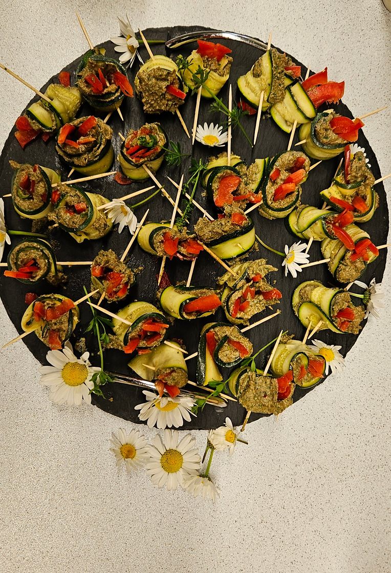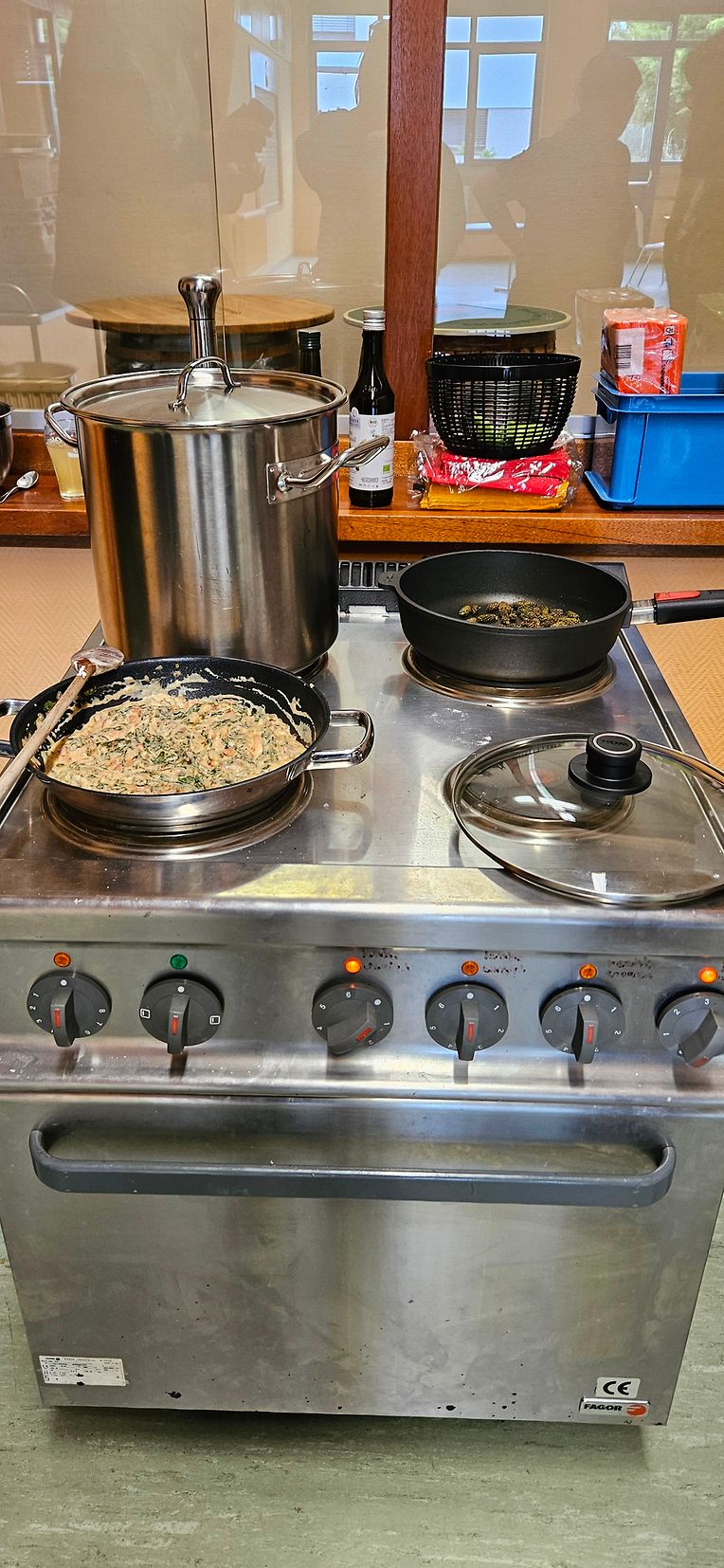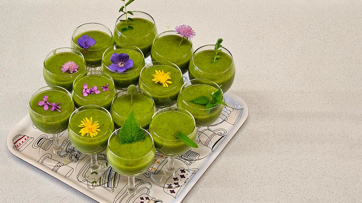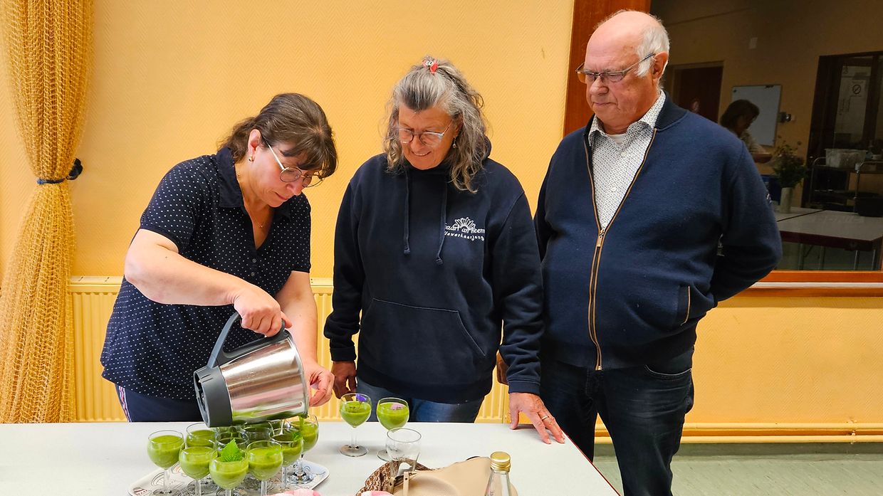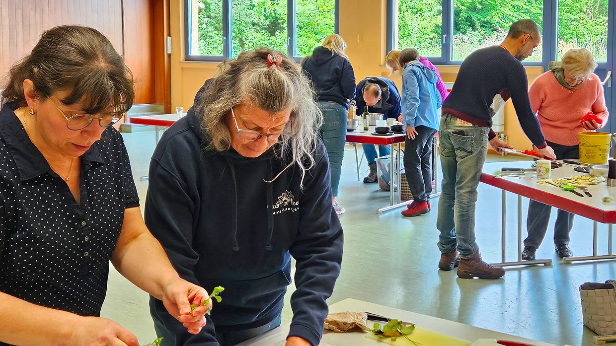 Nach der Wanderung ging es ins „Centre Polyvalent“. Dort hatte der Verein die Räumlichkeiten vorbereitet - weitere frische Kräuter sowie Fachliteratur waren zudem bereits ausgestellt worden. Nach einer abschließenden Kräuteruntersuchung durch Frau Hoffmann und einem Erfrischungstrank, teilte sich die Gruppe in vier Ateliers auf. Hier verarbeiteten die Teilnehmer die gesammelten Schätze kreativ zu vitalisierenden Smoothies, köstlichen Dips, herzhaften Involtini, aromatischem Kräuterpesto und einer alternativen Soße. Ein frischer Kräutersalat rundete die Zubereitungen ab.