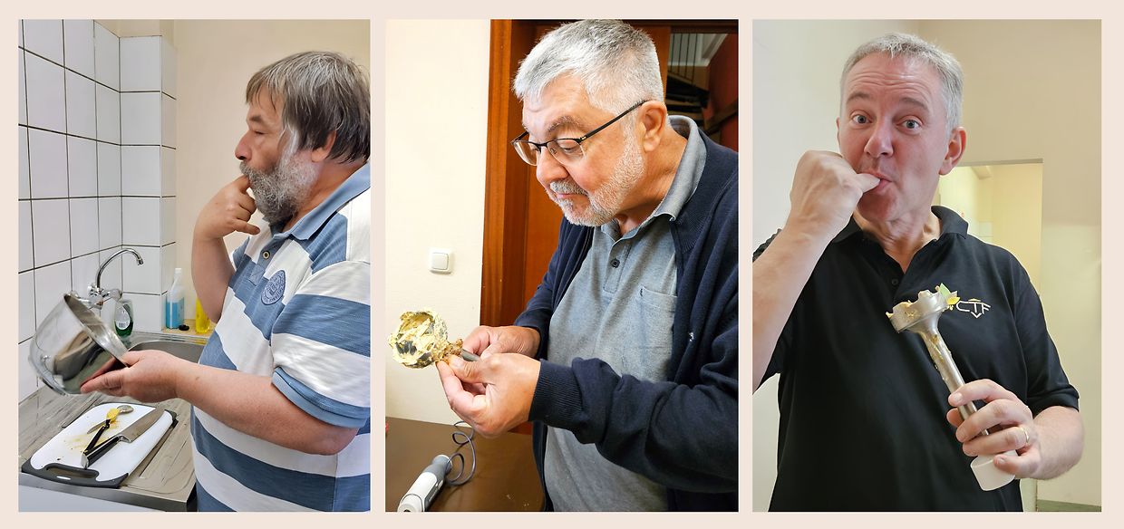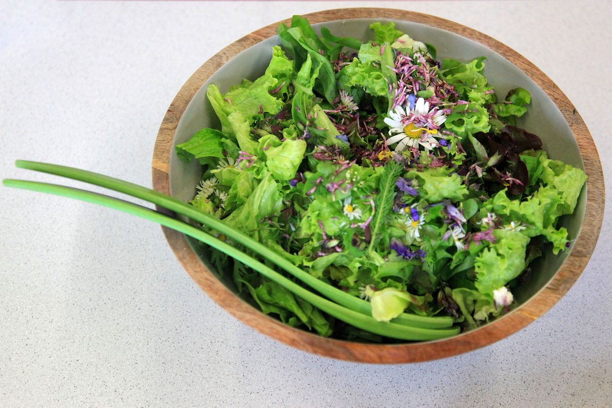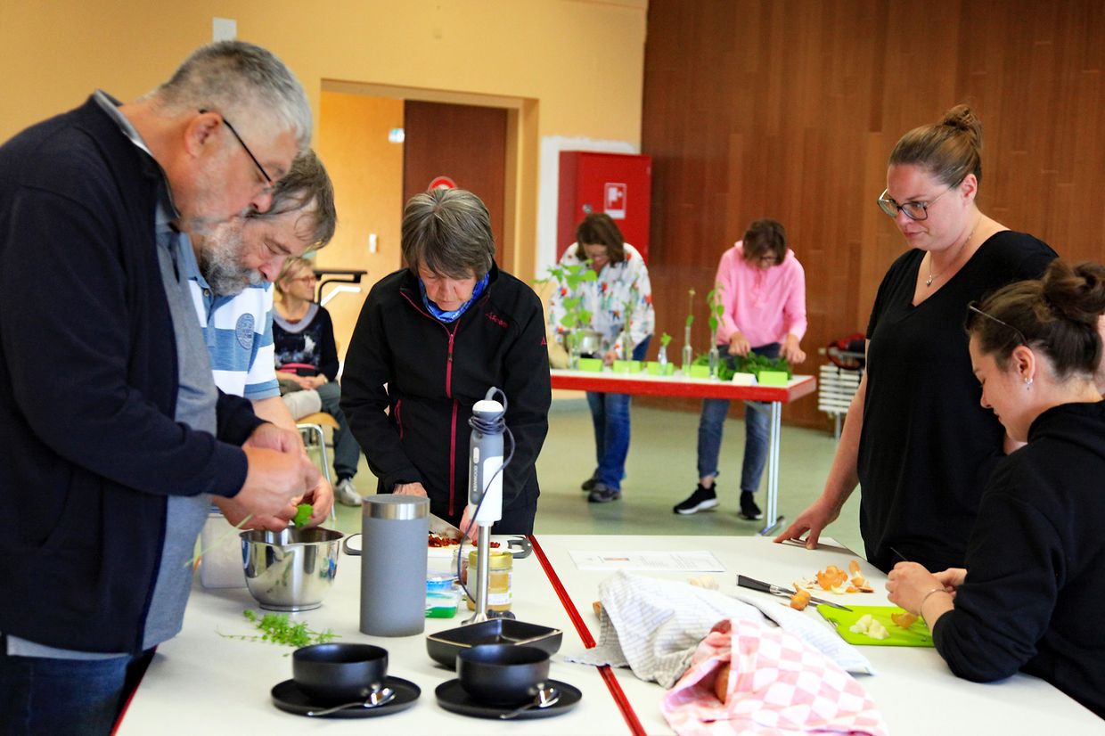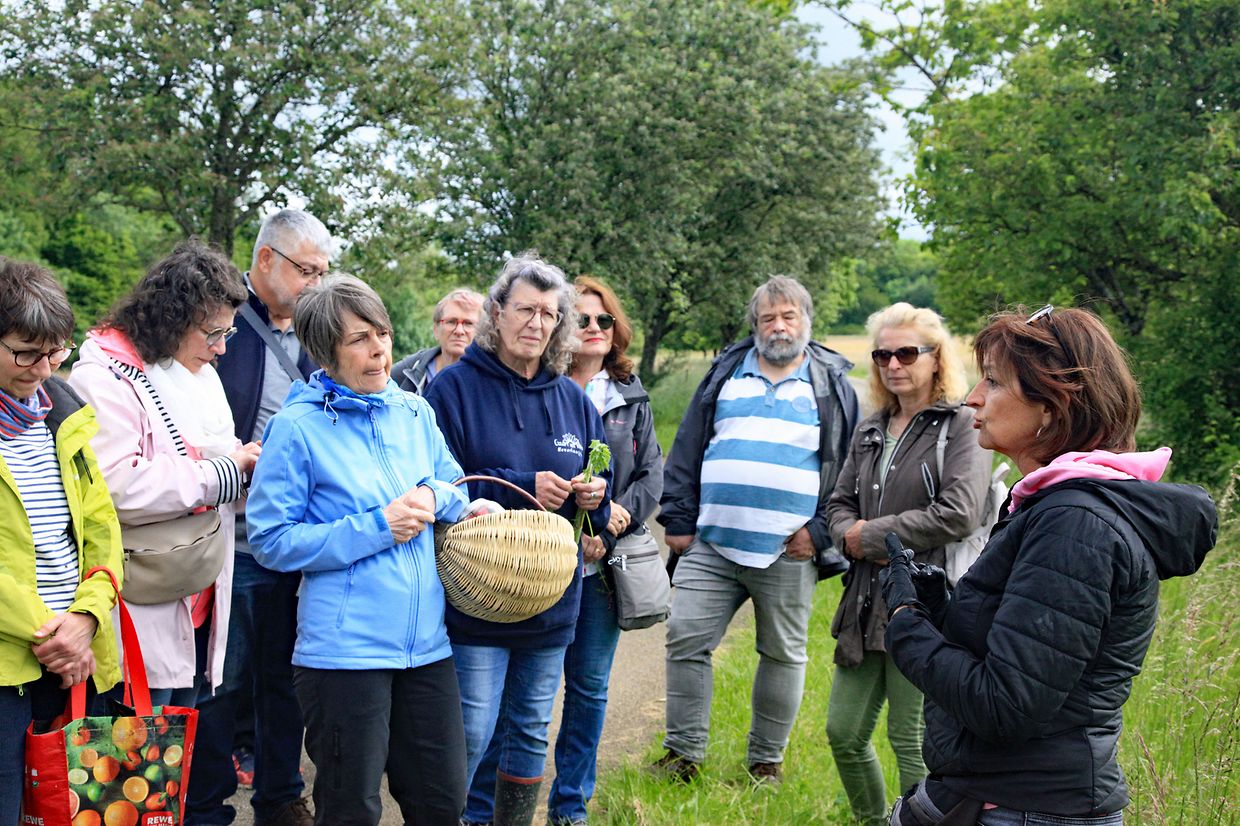 Am Nu pickt dee wëssbegierege Grupp zielstrebeg just dat eraus, wat fir dësen Dag gebraucht gëtt – net méi. Giersch stellt beispillsweis eng interessant Alternativ zu Spinat duer, d‘Stengele vum Wiesenbärenklau schmaachen no Spargel, mat Knoblauchrauke léisst sech excellent wierzen, Bléien vum Spitzwegerich loossen sech broden ewéi Champignon’en, Kléi mécht sech tipptopp an enger Zalot, an, an, an, …. Zefridde geet et kuerz drop mat der Recolte zeréck - a Richtung „Centre Polyvalent“. Hei ginn déi agesammelt Kraider dann zesummen an engem ganz liewege Kach- a Schmaachatelier zu leckere Plat’e verschafft, woubäi engem d’Waasser dann am Mond zesummeleeft. An et confirméiert sech alt erëm: et geet dach awer näischt iwwer gutt Noperen. Dem Veräin säi Schäffche fält aus an de frëndleche Restaurateur vu vis-à-vis spréngt op Anhieb an. Wou geet een dat nach sichen ? Ma op Uewerkäerjeng.