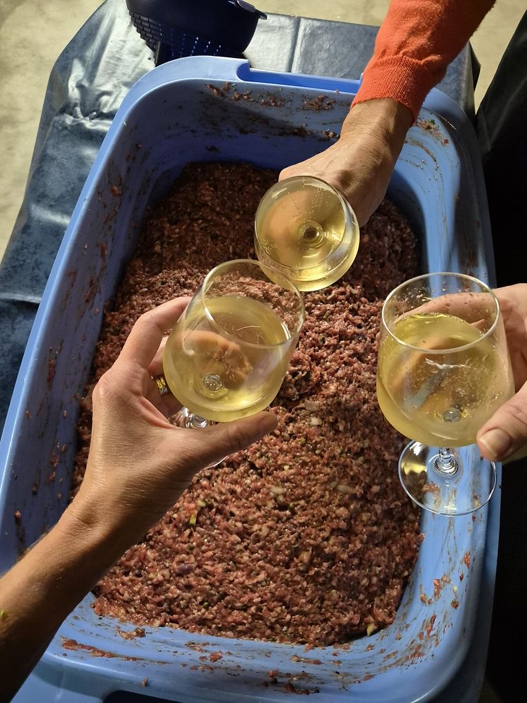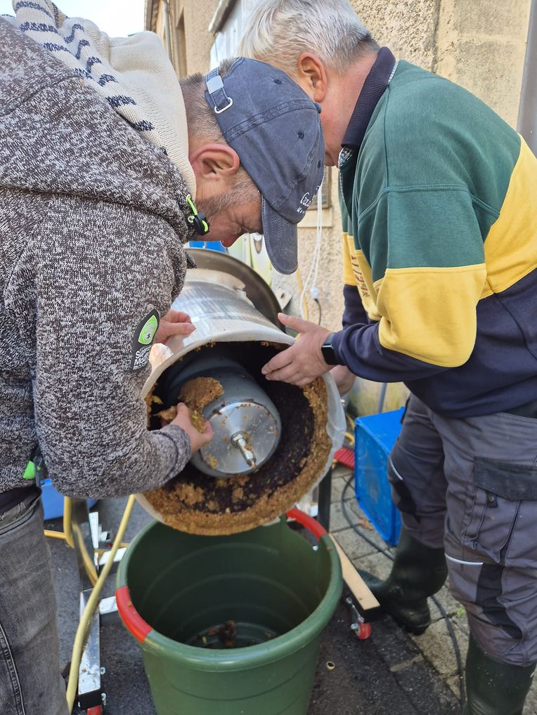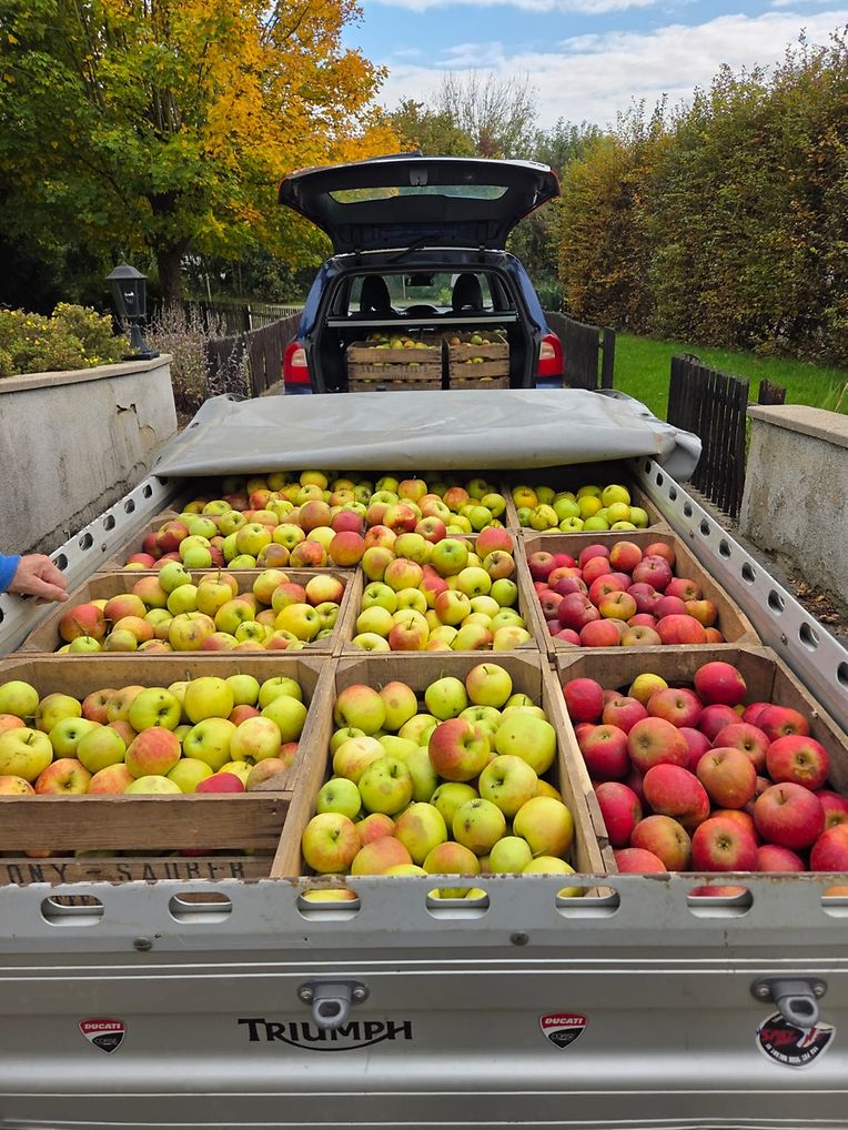 D'Viz-Äppel staamen, natirlech, vun nationaler Origine. Och fir dës Editioun gouf nees intensiv mat der APEMH zesummegeschafft, qualité oblige. Donieft huet de Veräin och an neit Geschier investéiert: Moser a Kelter, eng Hydropresse, si fonkelnei a feieren elo Première. Virun den Ae vun alle Gäscht gëtt Viz hei frësch gepresst, gefiltert an a Fläschen agefëllt. D'Freed ass grouss, bei allen, déi present sinn.