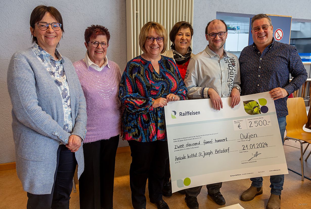 Zum Ofschloss vun der Versammlung konnt de President de Scheck mam Erléis vum Chrëschtconcert 2023 iwwerreechen. De Betrag vun 2.500 € geet un d’Amicale vum Institut Saint Joseph Betzdorf. Stellvertriedend fir d’Amicale bedanken seng Memberen Fabien a Christiane Brück sech beim Veräin fir dës generéis Ënnerstëtzung déi et hinnen erméiglecht vill interessant Projeten ze verwierklechen.
