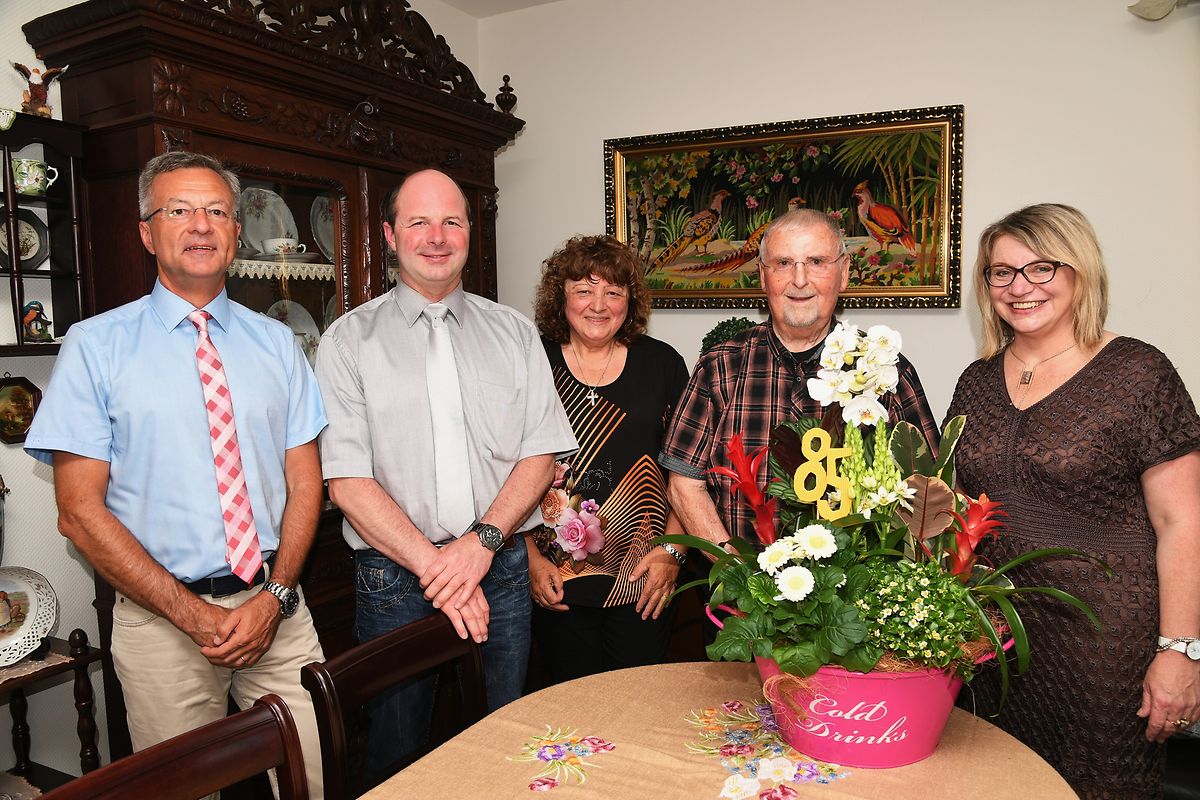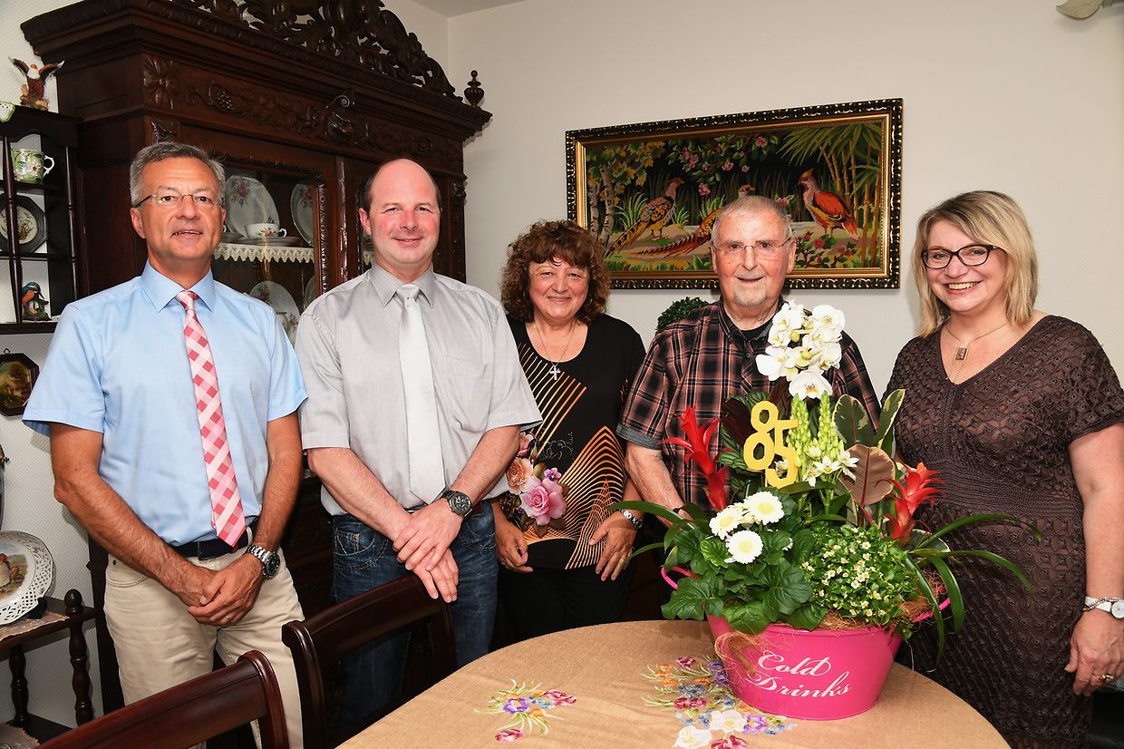 Ospern: Ben Scheer wurde am 17. Mai 1932 als viertjüngster Sohn von sieben Kindern der Eheleute Jean Scheer und Thérèse Wanderscheid in Niederwiltz geboren und konnte neulich in seinem neuen Zuhause in Ospern, wo der Jubilar seit 2013 seinen Lebensabend genießt, auf stolze 85 Lebensjahre zurückblicken. In seiner aktiven Berufszeit war Ben Scheer im Bauunternehmen später in der Leiterfabrik und zum Abschluss als Gemeindebeamter von 1973 bis zu seinem Ruhestand im Jahre 1992 in Wiltz beschäftigt. Die Heirat mit Georgette Schmitz aus Petingen fand am 18. April 1953 statt. Seine Freizeit genoss der Jubilar als leidenschaftlicher und ganz aktiver Feuerwehrmann wo er seit 1954 bis 2013 bei der Feuerwehr Wiltz mit dem Übernehmen von verschiedenen Posten innerhalb der Wehr, stets im Einsatz war. Den Posten des Kommandanten übte Ben Scheer von 1978 bis 1992 aus. Mit einem schönen Blumenarrangement überraschten Monique Kuffer, Heng Gerekens und Paul Zacharias, den 85-jährigen und rüstigen Jubilar und überbrachten die Gratulationen der Gemeinde Redingen/ Attert. Nach dem Anschneiden des Geburtstagskuchens wurde auf weitere gesunde Jahre angestoßen. (TEXT/FOTOS: CHARLES REISER)