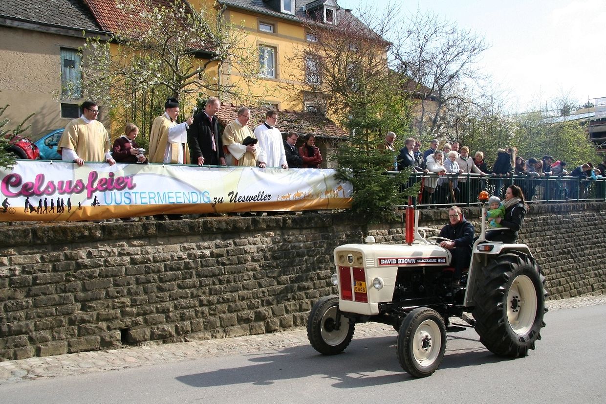 Mit dem Celsusmarsch von Matthias Steffen eröffnete die „Uesweller Musik“ die Segnung der Pferde und Fahrzeuge. Um den Celsussegen in Empfang zu nehmen, defilierten alsdann einige Reiterinnen mit ihren Pferden, viele Kinder mit ihren zwei-, drei- oder vierrädrigen Untersätzen sowie zahlreiche Traktor-, Auto- und Busfahrer vor der Kirche. Auch die Feuerwehren der Gemeinde Rosport hielten darauf, ihre Einsatzfahrzeuge unter den Schutz des heiligen Celsus zu stellen. Die Mitglieder des „Club des Jeunes“ überreichten den Pferdehaltern gesegneten Hafer und allen Teilnehmern Ostereier. Anschlieβend luden sie zu einem geselligen Beisammensein auf den Dorfplatz ein, wo der Tag bei Speis und Trank ausklang.