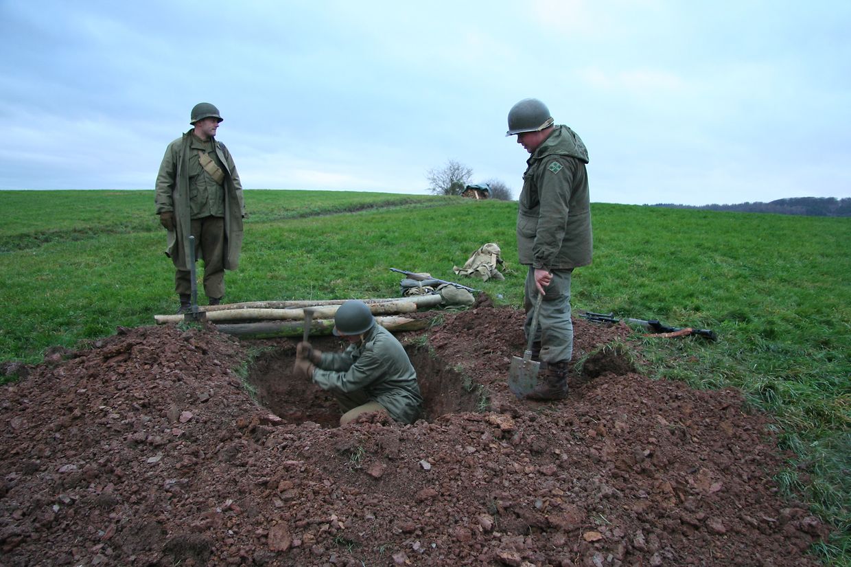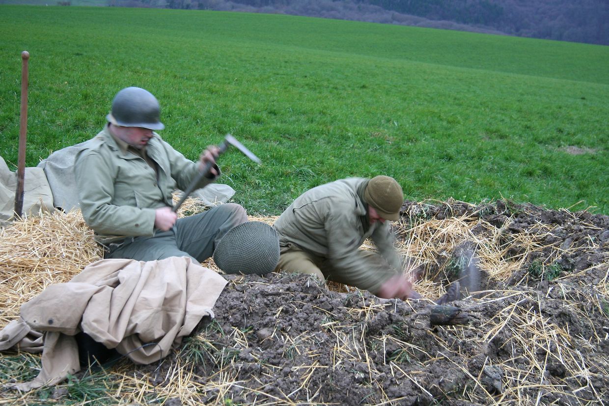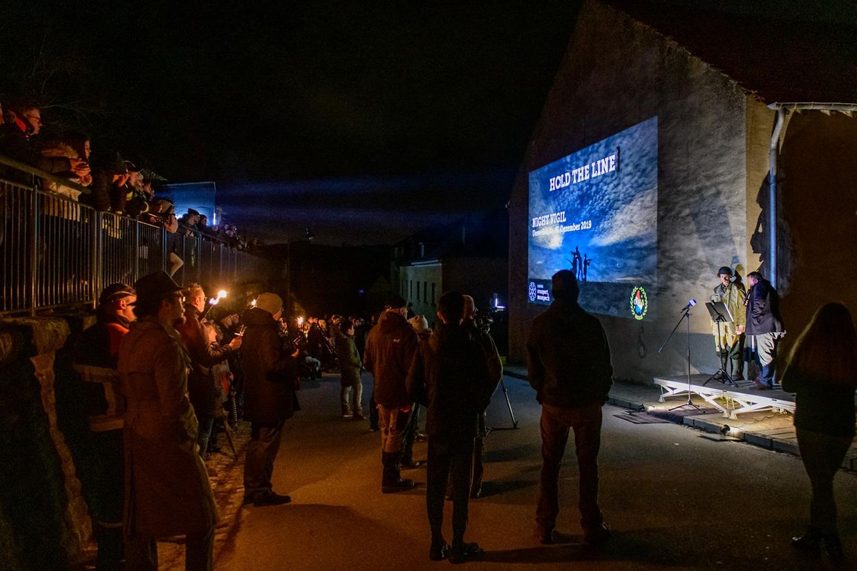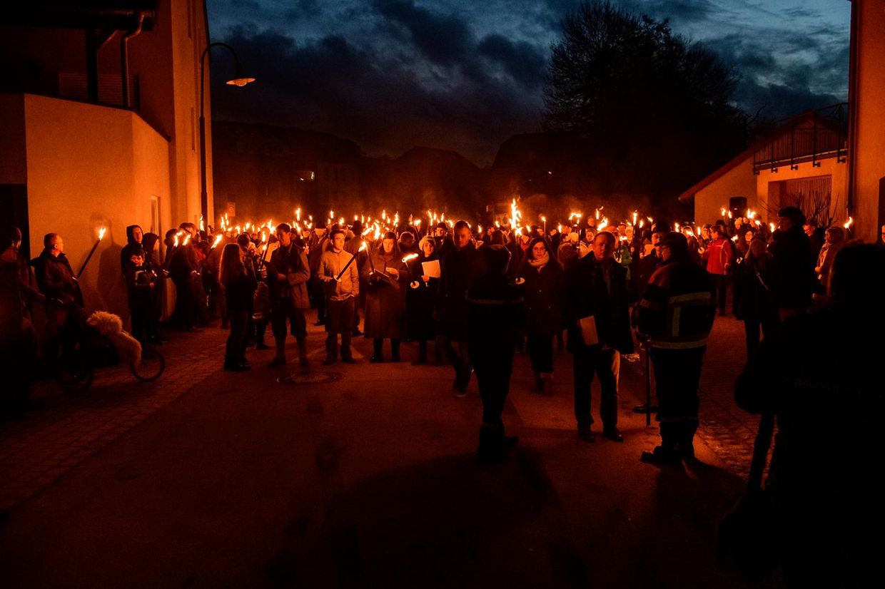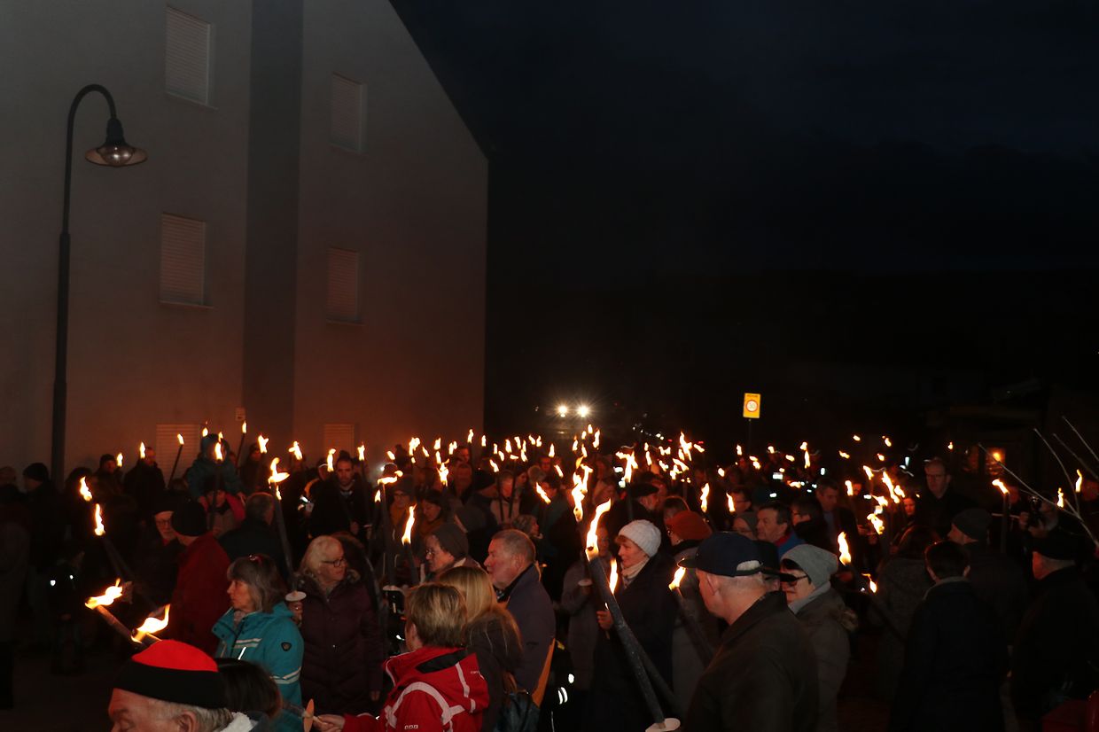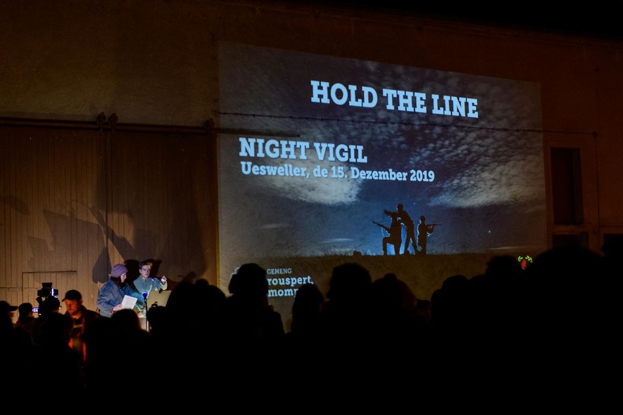 Um 17.00 Auer hate sech d’Leit Rendez-vous op der Duerfplaz zu Uesweller ginn. Am Fakelzuch ass et a Richtung «Schlammfuer» gaangen, wou de Mich Zeimet vum CEBA de Leit Informatiounen iwwer déi sougenannten «Foxholes» ginn huet. Um Wee zréck an de Centre Culturel «a Lannen» goufen Projektioune mat Bildmaterial un zwee Hausgiewele gewisen. Ënnerluecht goufen déi Opnamen vun Texter aus Tagebicher a Berichter vum William S. Nickell, Edouard Bisenius an Albert Toussing, déi vum Millie Beneké, Sanny Schwartz, Daniel Bisenius a Stefan Fandel virgedroen goufen.