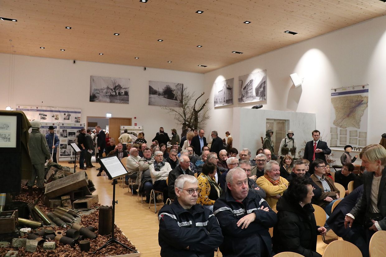 Den Ufank huet den 12. Dezember 2019 d’Ouverture vun der Ausstellung «Frontgebitt» am Centre Culturel «a Lannen» zu Uesweller gemaach. Dës Austellung gouf an Zesummenaarbecht mam CEBA, dem «Cercle d’Études sur la Bataille des Ardennes», konzipéiert an opgeriicht. Hei kënnen d’Visiteuren nach bis den 12. Januar e puer Abléck an déi deemoleg Zäit kréien, dëst unhand vu konkreten Zeenen déi sech an den Dierfer vun eiser Gemeng ofgespillt hunn. Um selwechten Owend gouf d’Buch «Mir musse fort» vum Service Historique vun der Gemeng virgestallt. An dësem Buch gëtt sech mat der Thematik vun der Evakuatioun an eisen Dierfer wärend der Ardennenoffensiv ausernee gesat. Musikalesch gouf dësen Owend vum Cello-Ensemble vun der regionaler Musekschoul vun Iechternach begleet.