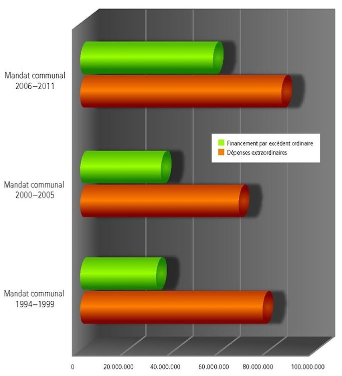Au cours du récent mandat communal (2006 - 2011), les dépenses extraordinaires s'élèveront à quelque 85 millions €, une nette progression par rapport aux deux mandats communaux écoulés, à savoir les mandats 1994 - 1999 (77 millions €) et 2000 - 2005 (67 millions €). Dans la période de 2006 - 2011, le financement des dépenses extraordinaires est assuré à concurrence de 65 % (56 millions €) par les excédents ordinaires de la même période, une nette amélioration par rapport aux périodes précédentes, à savoir celles de 1994 à 1999 avec 41 % (32 millions €) et de 2000 à 2005 avec 50 % (34 millions €).
