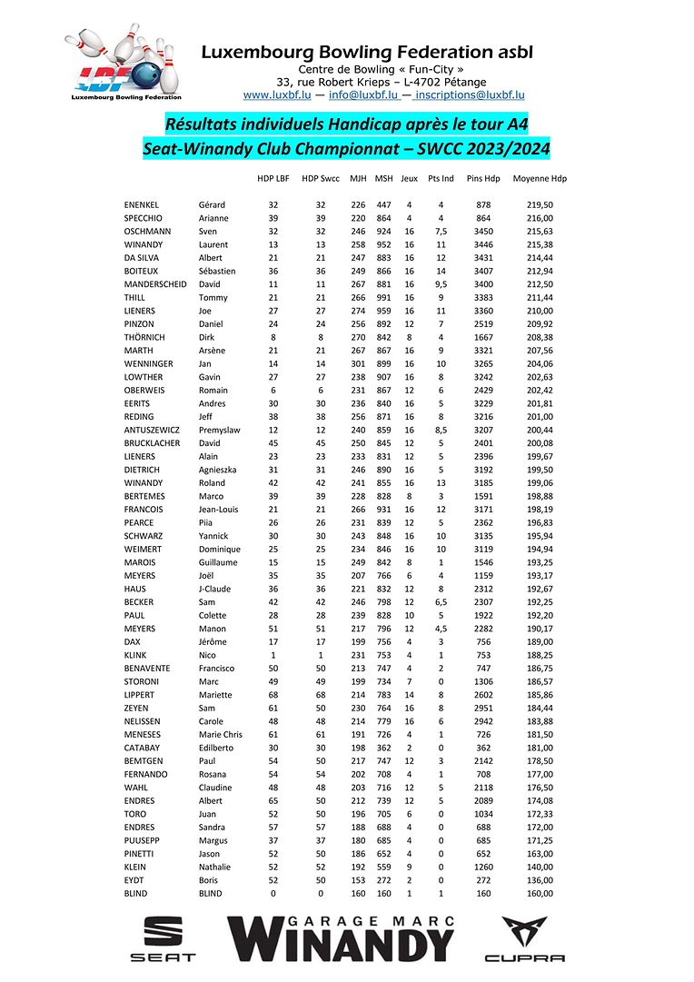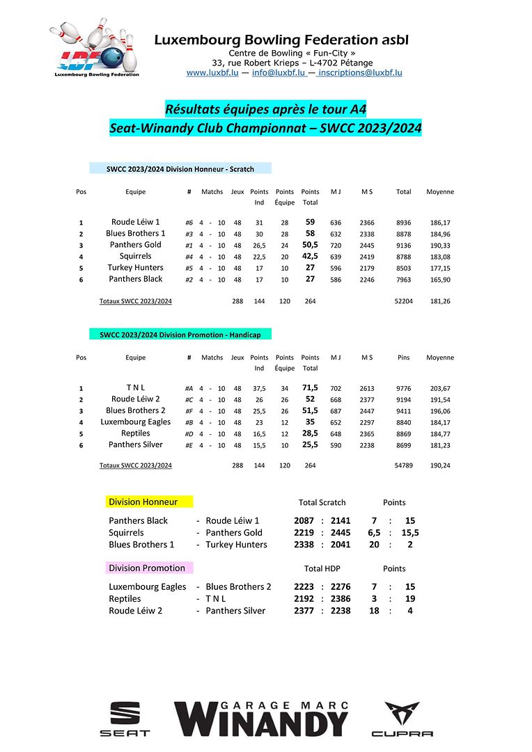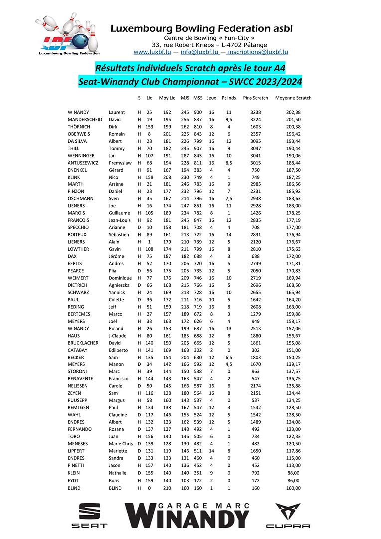 Petingen LBF - Tour 4 vum SWCC Luxembourg Bowling Federation 4 Bildergalerie Bitte scrollen Sie nach unten,um weitere Bilder zu sehen. Veröffentlicht am Samstag, 11. November 2023 um 21:11 Petingen, Luxemburg Resultater vum Seat Winandy-Club Championnat 2023/2024 (SWCCC) Tour 4 Unpassenden Inhalt angeben Weitere Neuigkeiten von Luxembourg Bowling Federation > LBF - Tour 2 vum Championnat Doublette 2024/2025 16.12.24 Petingen LBF - Tour 4 vum SWCC 2024/2025 09.12.24 Petingen LBF - Tour 1 du Championnat Doublette 2024/2025 01.12.24 Petingen LBF - Resultater vum Fun-Turnéier 9 No-Tap 23.11.24 Petingen LBF - Tour 3 vum SWCC 2024/2025 18.11.24 Petingen