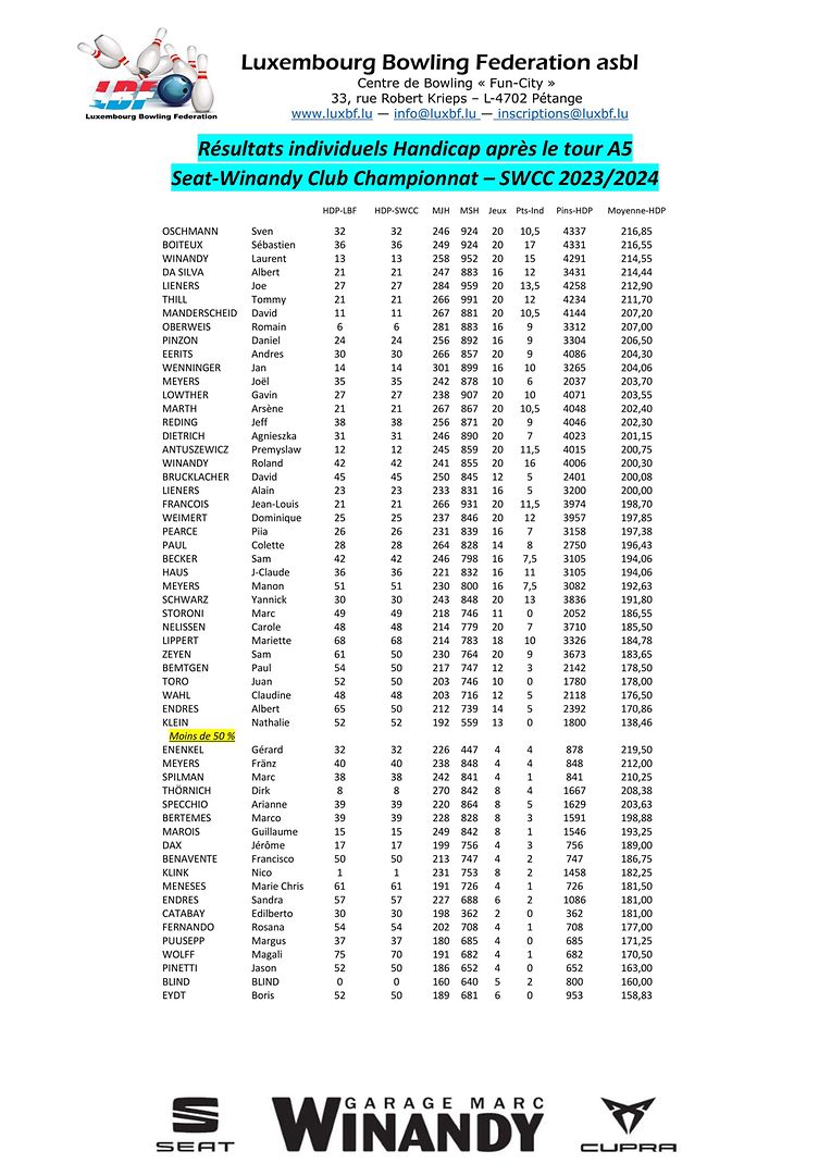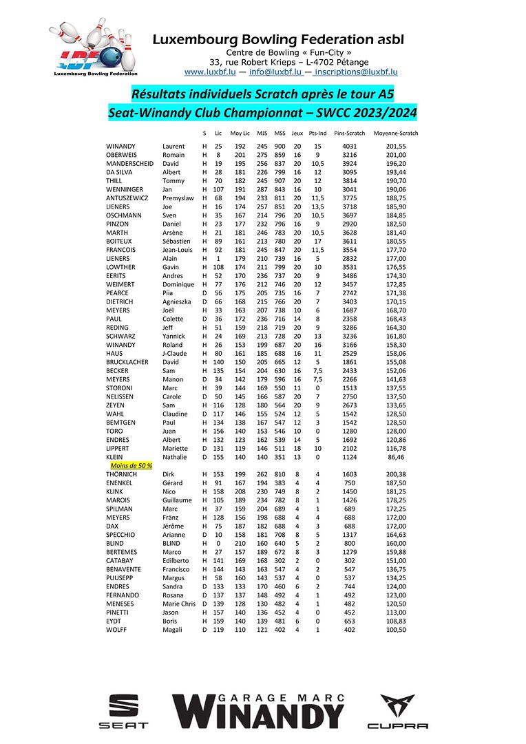 Petingen LBF - Tour 5 vum SWCC Luxembourg Bowling Federation 4 Bildergalerie Bitte scrollen Sie nach unten,um weitere Bilder zu sehen. Veröffentlicht am Freitag, 24. November 2023 um 14:14 Petingen, Luxemburg Resultater vum Seat-Winandy Klubchampionnat 23/24 no den Aller-Matcher. D'LBF wenscht iech schéi Kreschtdeeg. Weider Info'en op www.luxbf.lu Unpassenden Inhalt angeben Weitere Neuigkeiten von Luxembourg Bowling Federation > LBF - Tour 2 vum Championnat Doublette 2024/2025 16.12.24 Petingen LBF - Tour 4 vum SWCC 2024/2025 09.12.24 Petingen LBF - Tour 1 du Championnat Doublette 2024/2025 01.12.24 Petingen LBF - Resultater vum Fun-Turnéier 9 No-Tap 23.11.24 Petingen LBF - Tour 3 vum SWCC 2024/2025 18.11.24 Petingen