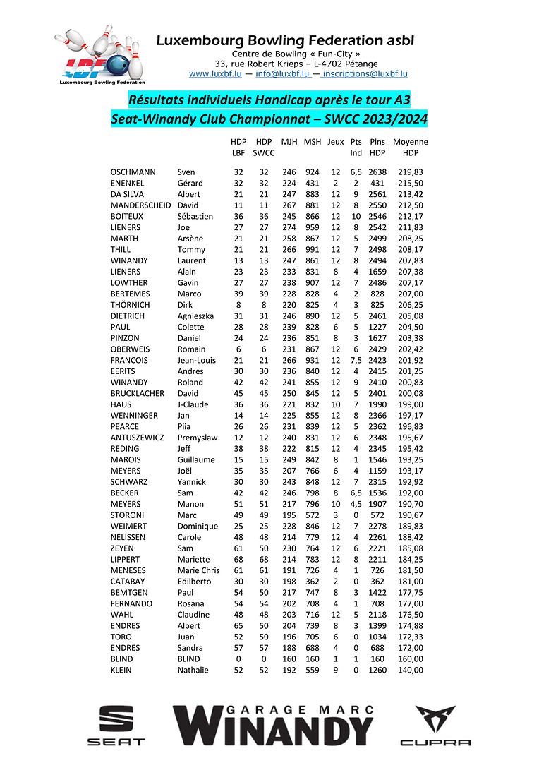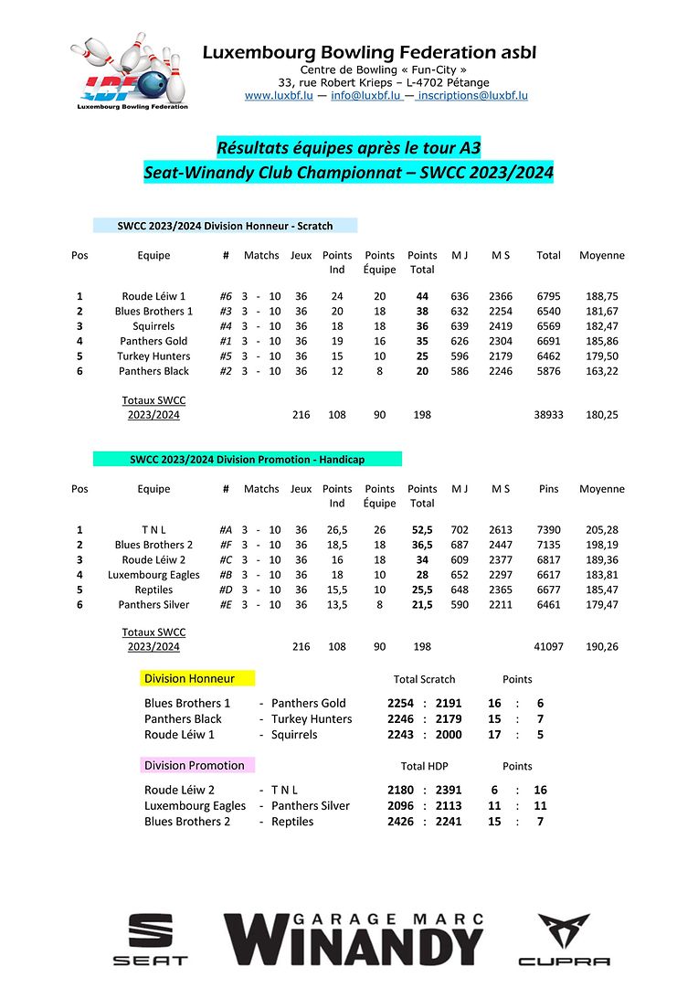 Petingen LBF - Tour A3 vum SWCC Luxembourg Bowling Federation 4 Bildergalerie Bitte scrollen Sie nach unten,um weitere Bilder zu sehen. Veröffentlicht am Freitag, 20. Oktober 2023 um 21:22 Petingen, Luxemburg Resultater vum drëtten Tour vun der Seat-Winandy Ligue 2023/2024 Unpassenden Inhalt angeben Weitere Neuigkeiten von Luxembourg Bowling Federation > LBF - Tour 2 vum Championnat Doublette 2024/2025 16.12.24 Petingen LBF - Tour 4 vum SWCC 2024/2025 09.12.24 Petingen LBF - Tour 1 du Championnat Doublette 2024/2025 01.12.24 Petingen LBF - Resultater vum Fun-Turnéier 9 No-Tap 23.11.24 Petingen LBF - Tour 3 vum SWCC 2024/2025 18.11.24 Petingen
