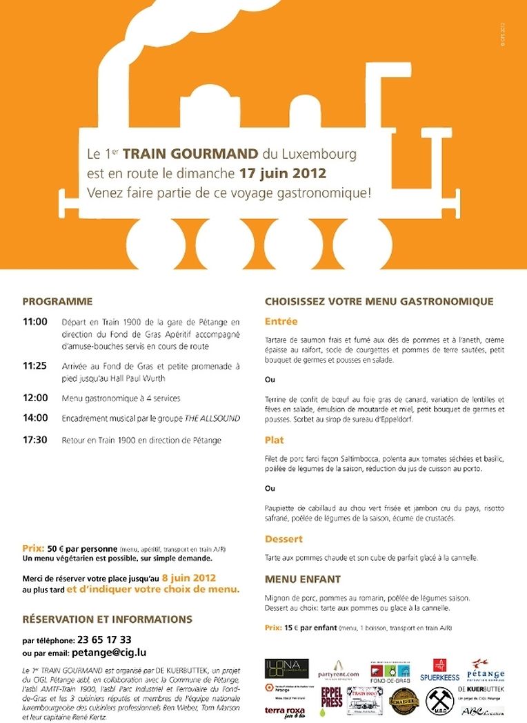 Le 1er TRAIN GOURMAND est organisé par DE KUERBUTTEK, un projet du CIGL Pétange asbl, en collaboration avec la Commune de Pétange, l’asbl AMTF-Train 1900, l’asbl Parc Industriel et Ferroviaire du Fond-de-Gras et les 3 cuisiniers réputés et membres de l’équipe nationale luxembourgeoise des cuisiniers professionnels Ben Weber, Tom Marson et leur capitaine René Kertz.