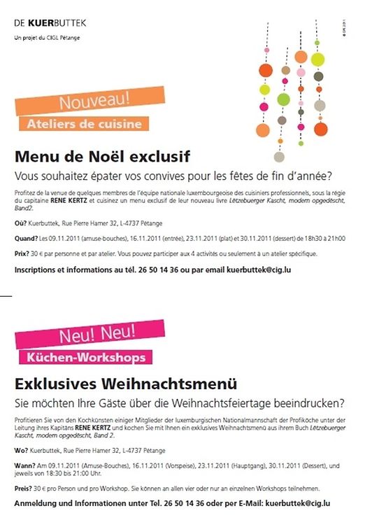 Pendant le mois de novembre, quelques membres de l’équipe nationale luxembourgeoise des cuisiniers professionnels, sous la régie du capitaine RENE KERTZ, vous proposeront de cuisiner un menu exclusif de leur nouveau livre Lëtzebuerger Kascht, modern opgedëscht, Band2. Etape par étape vous préparerez ensemble les amuse-bouches, l’entrée, le plat et le dessert. Vous pouvez participer aux 4 activités ou seulement à un atelier spécifique.