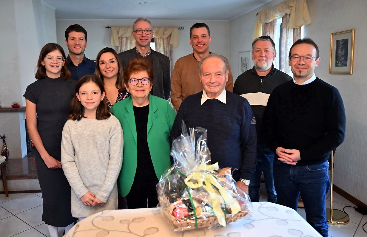 Platen: Op eng arbechtsräichst Berufsliewen kann den Francesco Manieri vu Platen zerëck kucken, den bei gudder Gesondheet säin 85. Gebuertsdag Doheem konnt feieren. Duefir war et vir de Buergermeeschter Marc Gergen begleet vu sengen béid Schäffen Fernand Muller an Marc Rehlinger eng ganz besonnesch Éier fir dem Jubilar mat enger gudd gefëllter Corbeille am Numm vun der Gemeng Préizerdaul ganz haerzlich ze gratuléieren. Den Francensco Manieri huet d’Liicht vun der Welt den 8. November 1938 zu Castelleone Di Suasa (I) erblëckt an dat als den 2. jëngsten Jong vun 7 Kanner. Seng Elteren waren den Alberto Manieri an d’Pierina Tiberi. Den 5. Februar 1966 ass Hochzäit gefeiert gin mam Adele Sebastianelli vun Mondavio (I). Zesummen wunnen sie säit 1966 an hirem neien Haus zu Platen am Préizerdaul, wou si sech och ganz wuel fillen. Aus hirem Bestiednis koumen no an no eng Duechter an e Jong op d‘Welt. Véier Enkelkanner zielen haut zum Stolz vun der Famill Manieri. A sengem aktiven Berufsliewen war den Francesco Manieri vun 1968 bis zu senger Pensioun am Joer 2000 als ganz engagéierten