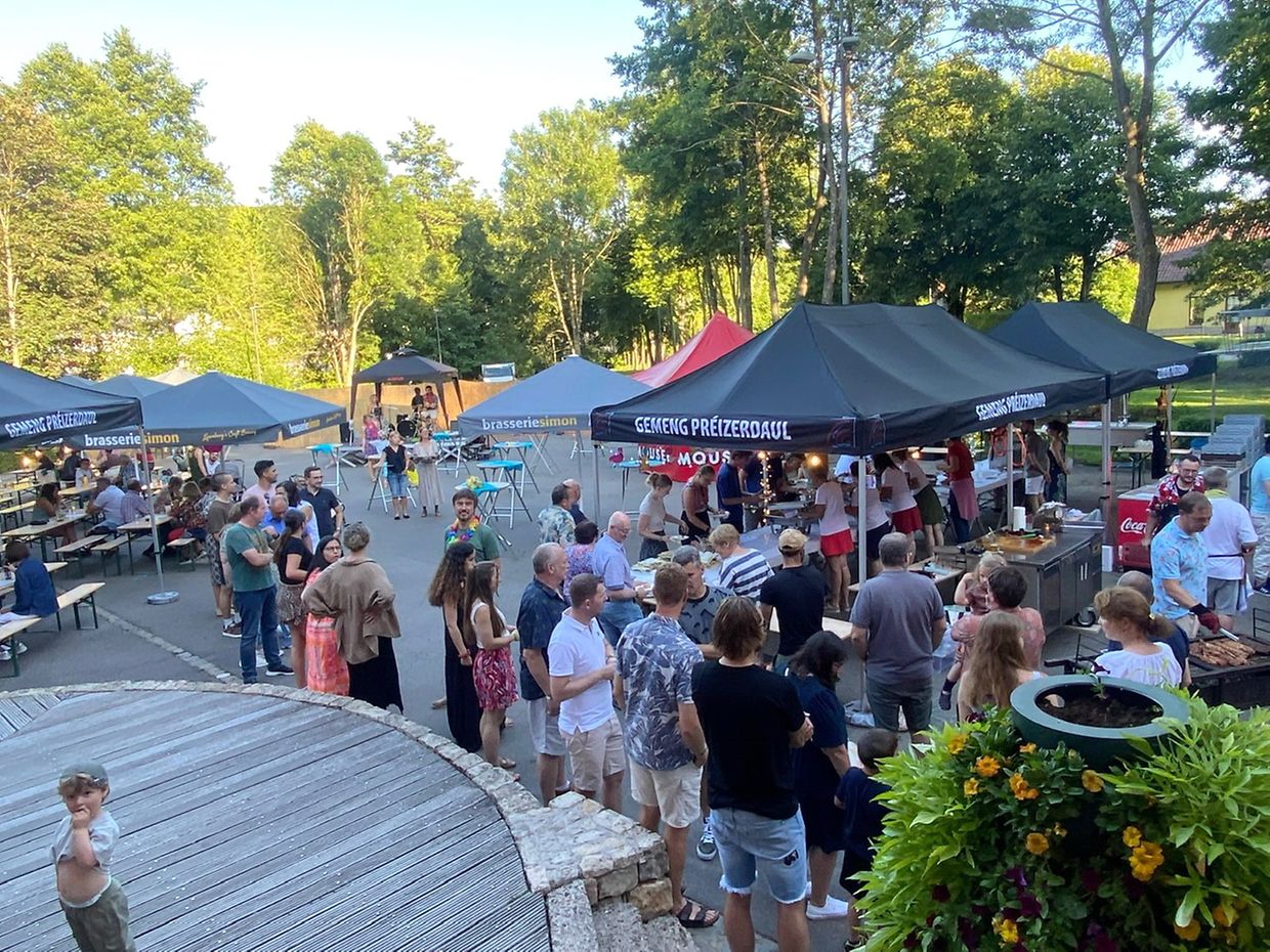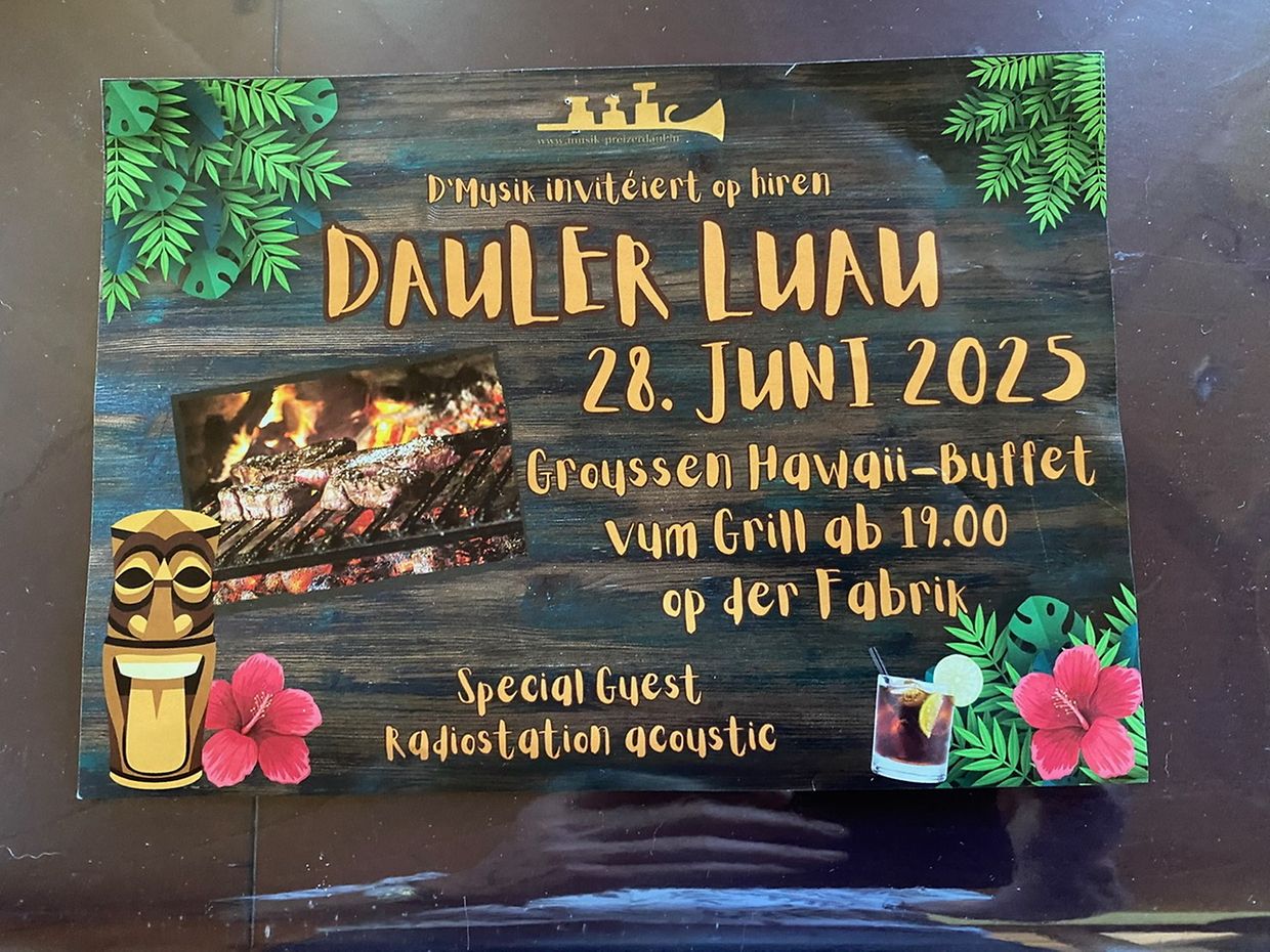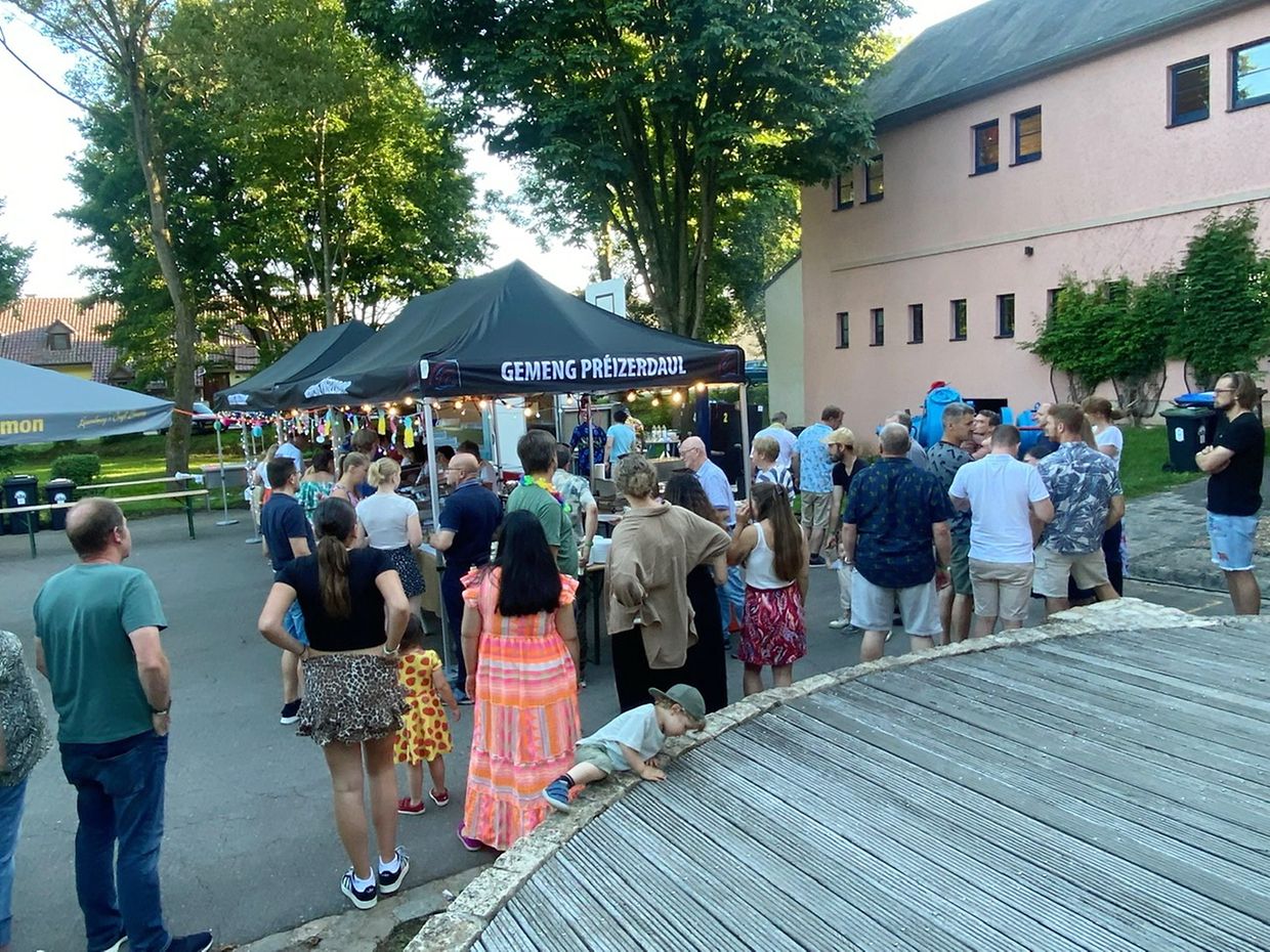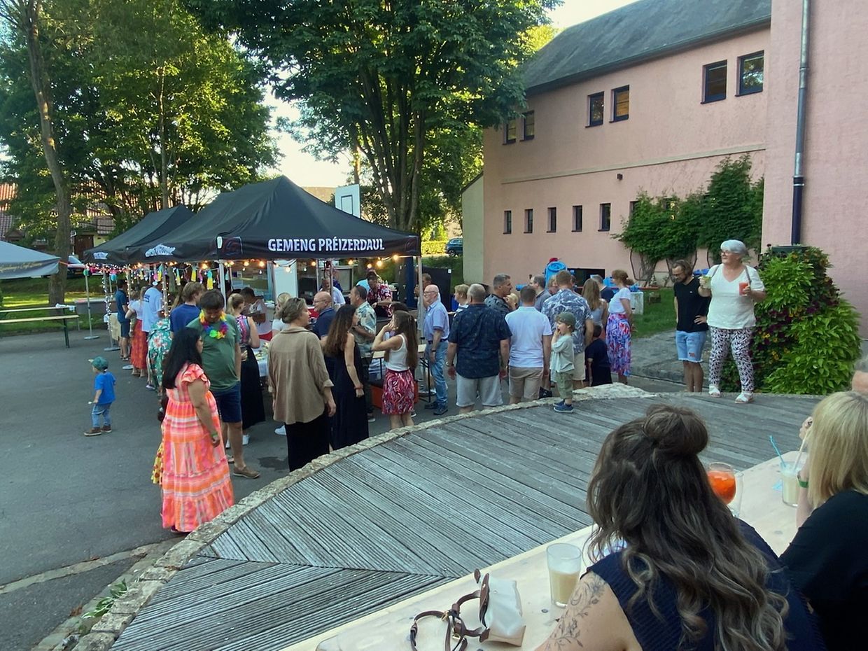 Préizerdaul: Bei angenehmen Summerwieder war die traditionell Oplag 2025 vum „Dauler Luau“ organiséiert vun der Préizerdauler Musik en vollen Erfolleg. Iwert 100 Leit haaten sech ugemellt, fir sech den Hawaii- Buffet à volonté ,och gut schmaachen ze loossen. No der Begréissung vum President Franz Hilger konnten die vill Leit – Grouss a KLeng- a flotter Ambiance e puer angenehmer Stonnen mateneen verbrëngen. Special Guest vum Owend war „Radiostation acoustic“ déi mat schéiner Musik fir gut Ënnerhaalung gesuergt huet. Eng Rum- Cocktail Bar- e sëffige Patt an och e gudden Dessert hun bei desem Owend nit gefeelt. Et war einfach flott. Di Préizerdauler Musik konnt mat desem Event vun desem Joer bestëmmt och bäschtens zefridde sin. (CR ) (Fotoen: Charles Reiser)