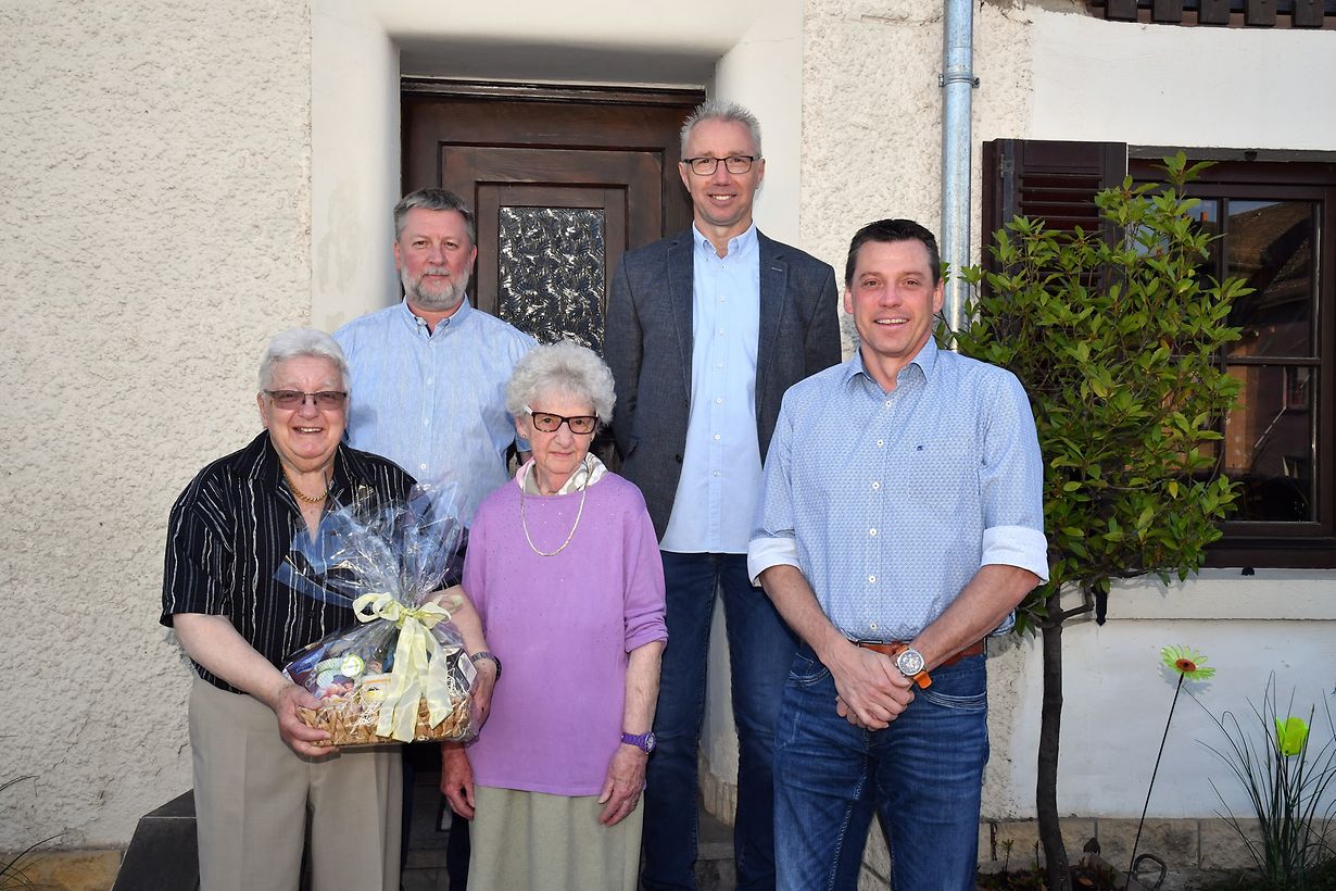 Platen: Mat enger gut gefëllter Corbeille war de Buergermeeschter Marc Gergen mat sengen zwéi Schëffen Fernand Muller an Marc Rehlinger viru kuurzem bei den Niki Frank op Platen komm, fir him fir sein säin 85. Gebuertsdag ze gratuléieren. Den Niki Frank koum den 25. Mäerz 1937 als eenzege Jong vum Brautpuer Franz Frank an Maria Schimberg zu Platen op d’Welt. D’Hochzäit mam Josette Bildgen vu Wolwen war den 27. Juli 1963. Aus hirem Bestiednis huet hire Jong Marc d’Liicht vun der Welt erblëckt. De Pol, hirt eenzegt Enkelkand gehéiert haut zum Stolz vun der Famill Frank. De Jubilar huet a sengem aktiven Berufsliewen wärend 40 Joer bei der lëtzebuerger Eisenbunn bis zu senger Pensioun sengt deeglicht Brout verdingt. Och als langjährige Sänger beim lokalen Gesangveräin war de Niki ganz aktiv. Zesummen gouf d’Glas erhuewen an op weider gesond an zefridde Joeren ugestouss gin. (CR ) (Foto: Charles Reiser)
