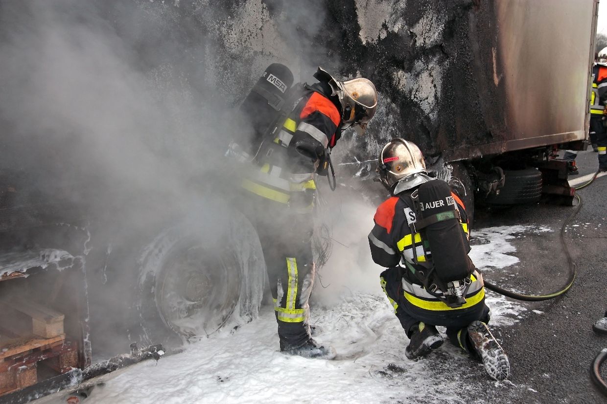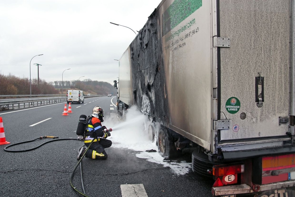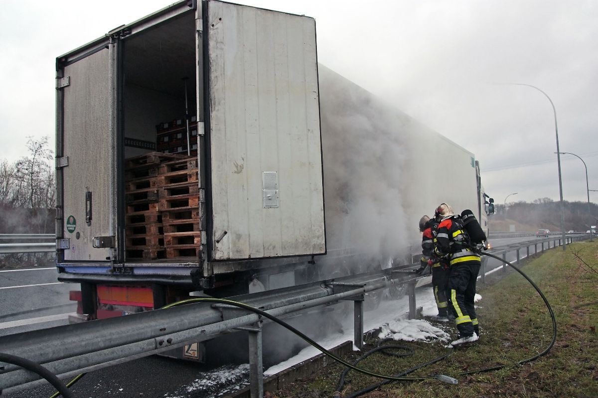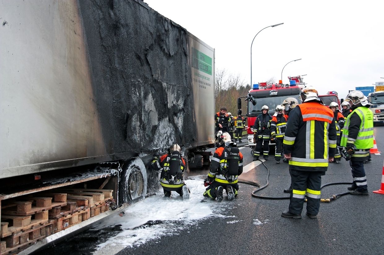 Der Fahrer eines Sattelzuges, der aus Richtung Luxemburg kam, hatte plötzlich in Höhe der Auffahrt Potaschberg bemerkt, dass es am Heck seines Anhängers zu einer Rauchentwicklung gekommen war. Daraufhin steuerte der Fahrer seinen Lastwagen auf die Standspur und hielt dort an. Bei seiner Kontrolle musste er jedoch feststellen, dass die Räder des Anhängers bereits voll in Brand waren. Die herbeigerufenen Rettungskräfte mussten wegen der starken Rauchentwicklung schweren Atemschutz anlegen, um gegen die Flammen vorgehen zu können. Es gelang ihnen, den Brand schnell unter Kontrolle zu bekommen, konnten jedoch nicht verhindern dass der Anhänger stark in Mitleidenschaft gezogen wurde. Die Ladung, bestehend aus mehreren Tonnen Apfelsinen, blieb jedoch unversehrt. Auch wurde niemand bei dem Zwischenfall verletzt. Die Autobahn musste während der Dauer der Lösch- und Bergungsarbeiten auf eine Fahrspur reduziert werden, was zu erheblichen Verspätungen im Feierabendverkehr führte.