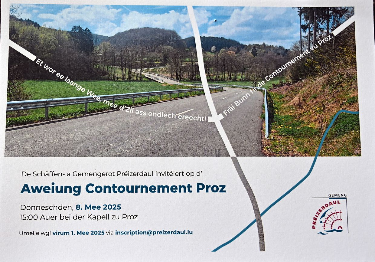 Pratz Aweiung vum neien Contournement zu Proz Charles Reiser 50 Bildergalerie Bitte scrollen Sie nach unten,um weitere Bilder zu sehen. Veröffentlicht am Donnerstag, 8. Mai 2025 um 18:54 Pratz Préizerdaul, Luxemburg E grousse Projet ass elo Wirlichkeet . (Fotoen: Charles Reiser) Unpassenden Inhalt angeben Weitere Neuigkeiten von Charles Reiser > Dem Jeanny Keltesch- Wolf zum 95. Gebuertsdag gratuléiert. 04.12.25 Pratz Happy Birthday fir d'Irma Kobs- Loes zum 90. Gebuertsdag 03.12.25 Bondorf Aktiv Frae Miersch hun 65 000 Euro u 17 Organisatiounen gespent 03.12.25 Mersch Réidener Wanterlaf ënnerstëtzt U.B.K.A Lëtzebuerg - Biker mat groussem Häerz 01.12.25 Redingen Dammenturnclub vun Mäerzeg iwerreecht 5000 Euro fir de gudden Zweck 30.11.25 Mertzig