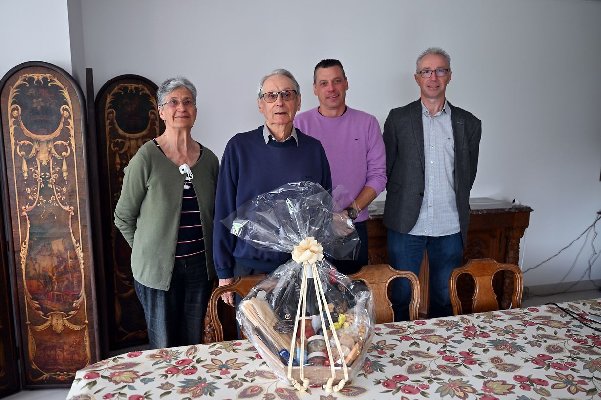 Pratz: La viste du bourgmestre Marc Gergen avec son échevin Marc Rehlinger, représentant la Commune du Préizerdaul, avec la remise d’une belle corbeille remplie de produits régionaux, était récemment la grande surprise pour Monsieur Yves Legros qui avait la chance de fêter son 85e anniversaire en bonne santé. Yves Legros est né le 24. Juin 1939 en France. Le jubilaire est le plus jeune des parents de Robert Legros et Céline Monfourny, d’une famille de 4 enfants. Le jour du mariage avec Marie- Agnès Goffart, née en France- leurs parents d‘origine belge, date du 15 novembre 1965. Quatre filles ont vue la lumière du jour de leur mariage harmonieux. Aujourd’hui la famille Legros compte neuf petits- enfants. Dans sa vie active , Monsieur Yves Legros , a exploité deux fermes comme cultivateur en France, pour enfin prendre sa pension dans l’année 2012. Le couple habitait d’abord dans une maison à Kehlen pour enfin profiter ensemble le repos de leur vie depuis le 31 octobre 2014 dans leur nouvelle maison à Pratz (Bettborn. Encore beaucoup d’années ensemble en bonne santé, clôturait le petit moment agréable chez Monsieur Yves Legros pour son 85e anniversaire. (CR) (Photo: Charles Reiser)
