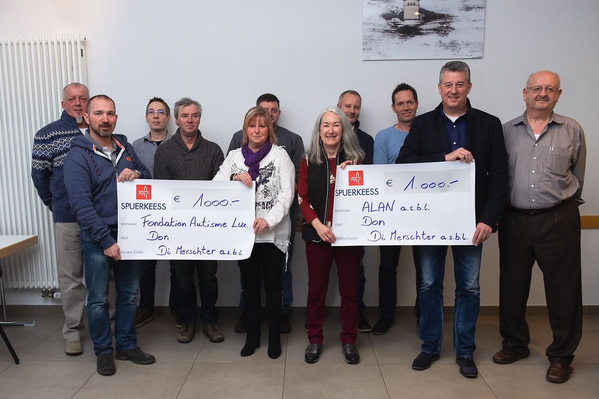 Zu Mierschent waren se dëser Deeg zimlech spendabel. Gläich 2 Schecken hunn Di Merschter A.s.b.l am Kader vun hirer Generalversammlung ausgedeelt. Vum Erléiss aus de ville Manifestatiounen iwwert d'Joer, goungen eemol dausend Euro un d'Asbl "ALAN, Maladies rares Luxembourg", an en aneren Don vun dausend Euro goung un "Fondatioun Autisme Luxembourg". Di Responsabel vun den 2 Associatiounen hunn dovu profitéiert fir sech an di verschidde Projete virzestellen wou d'Suen investéiert ginn. Zesumme mat den Duerfleit gouf dunn bei engem gudde Patt den Owend verbruecht.