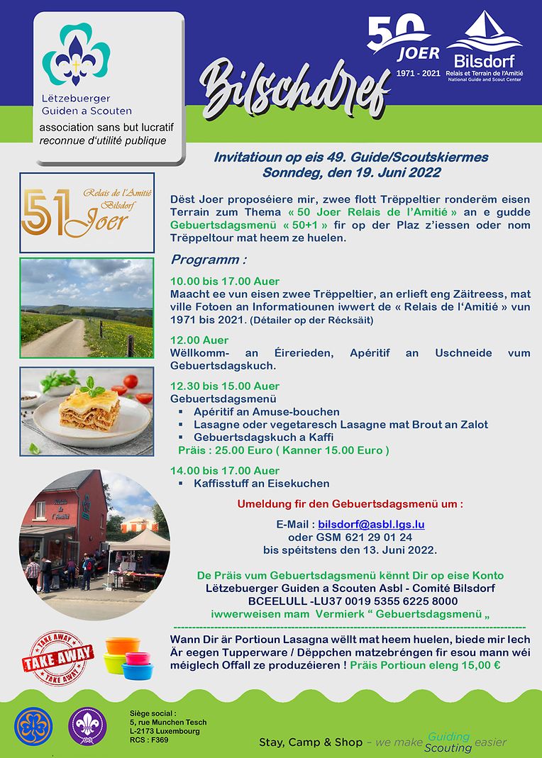 Dëst Joer proposéiere mir, zwee flott Trëppeltier ronderëm eisen Terrain zum Thema « 50 Joer Relais de l’Amitié » an e gudde Gebuertsdagsmenü «50+1» fir op der Plaz z’iessen oder nom Trëppeltour mat heem ze huelen.