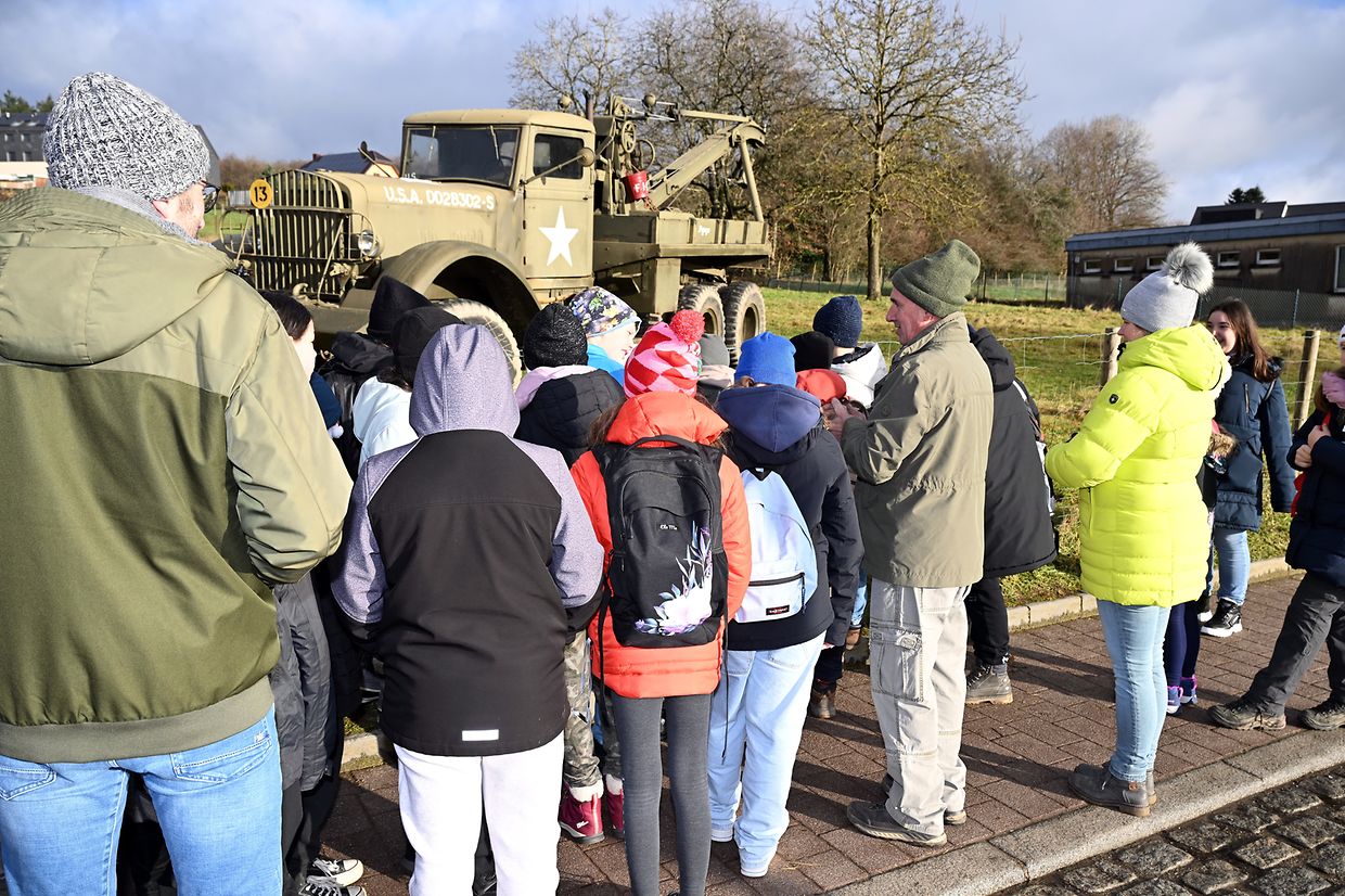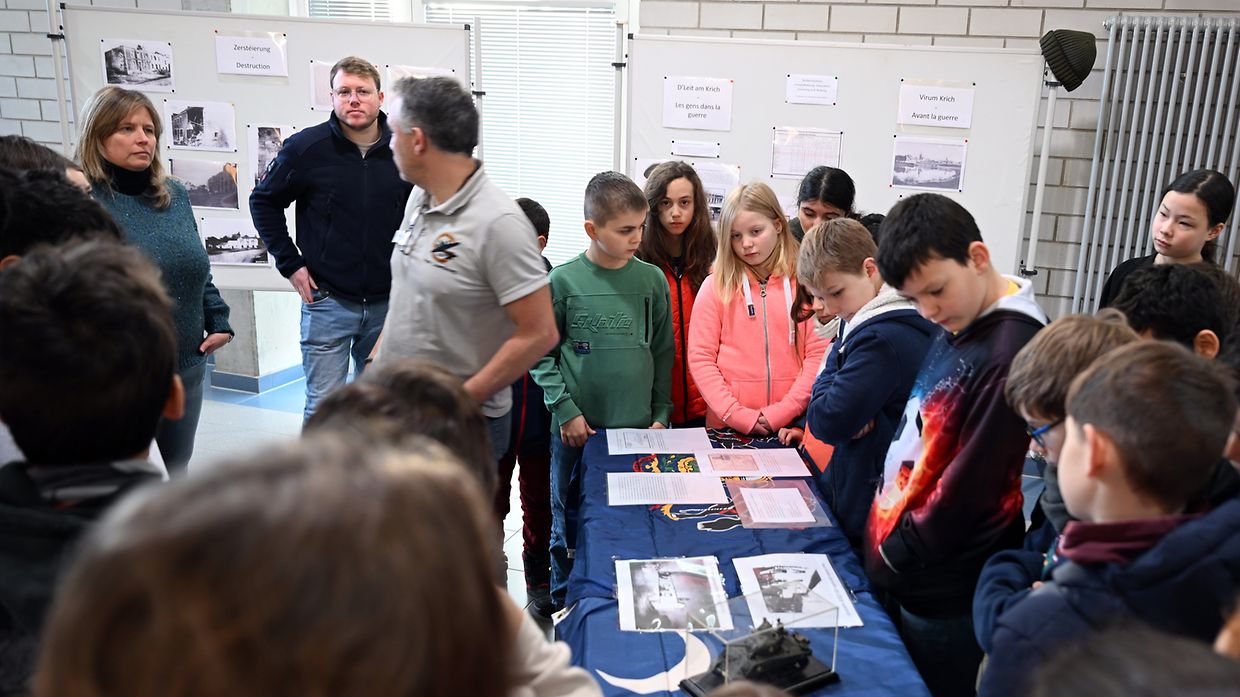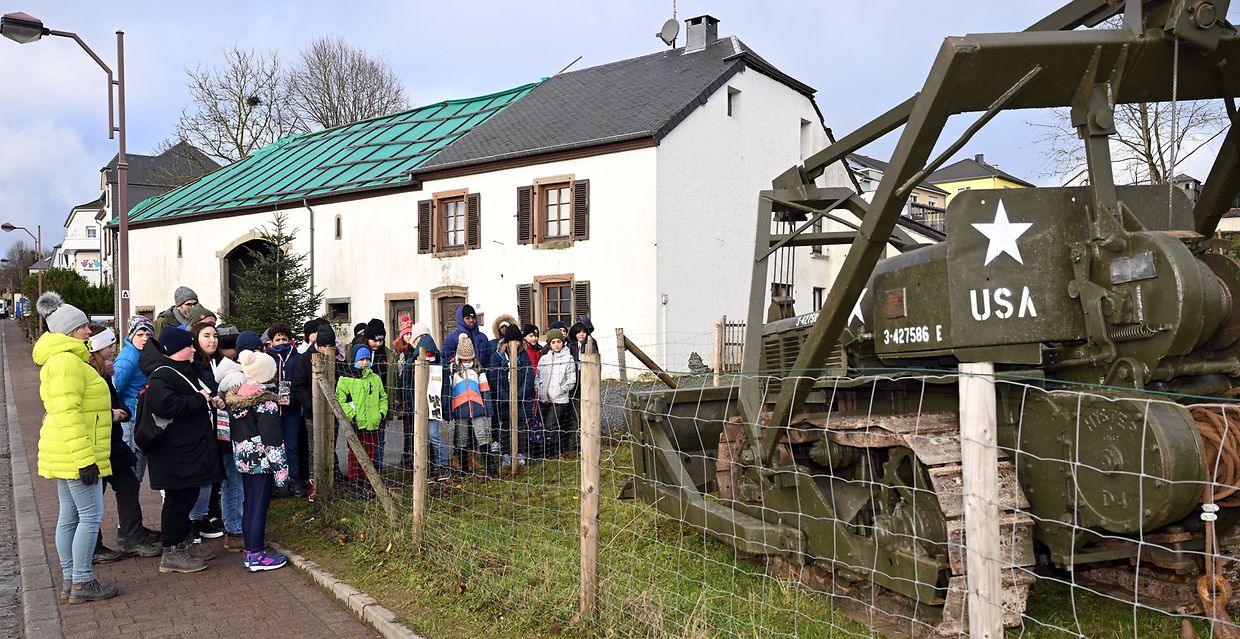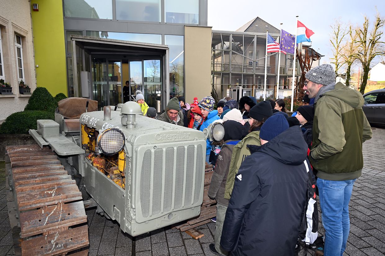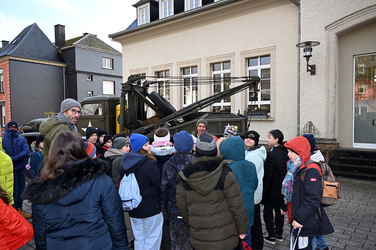 Dat 5.an dat 6. Schouljoer mat hiren Enseignants, aus der Kietschder Schoul, haten d'Geleeënheet fir am Kader vun engem Infodag mat Virféierungen, Ausstellungen an enger Gedenkzeremonie beim Denkmal zu Rammerich un d'Befreiung virun 80 Joer vun der Ardenneroffensiv erënnert ze gin. Ganz interessant war och den Interview mam Här Andy King, op der Gemeng mat de Schoulkanner, dem säi Papp aktiv bei der Befreiung vun der Uertschaft Rammerich mat gekämpft huet. Dobäi huet de Schëfferôt dem Här Andy King engt interessant Buch, als Kado, iwerreecht. (CR) F(Fotoen: Charles Reiser)