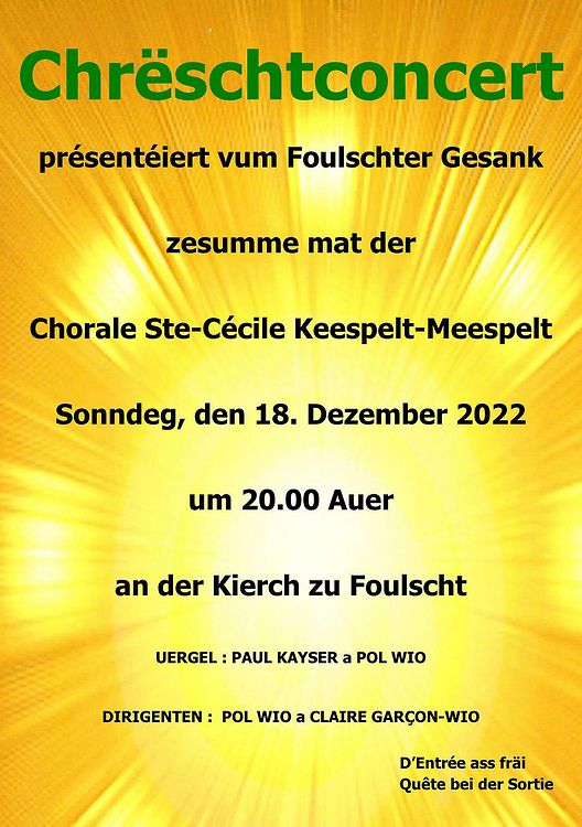 De Foulschter Gesank invitéiert Iech ganz häerzlechst op säin traditionelle Chrëschtconcert de 18.12.2022 zu Foulscht an der Kierch. Dëst Joer hu mir Chorale Sainte Cécile vu Keespelt/Meespelt als Gaascht bei äis. Loosst Iech mat besënnlechen a freedege Melodien op Chrëschtdag astëmmen! Wéi all Joer invitéiere mir Iech nom Concert op eng Zopp mat engem gudde Patt an de Centre Culturel.
