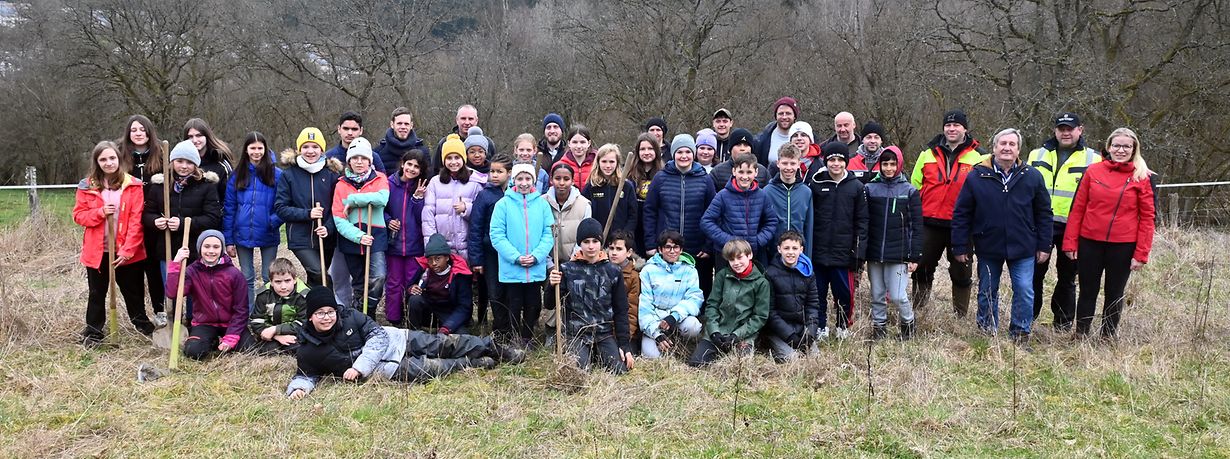 Rammerich: Am Kader vun énger gréisserer Bongertenplanzaktioun hun 40 Schüler aus dem Zykel 4.2 vun der Kietschter Grondschoul Uebstbeem op énger Fläch am Naturschutzgebitt Pont-Misère geplanzt. De Fieschter Serge Hermes huet de Schülerinnen a Schüler de Sënn a Notze vun den Uebstbeem erklärt an hinnen matgedeelt, dat dess Planzaktioun virun allem derzou bäidréit, nieft der Opwaertung vum Landschaftsbild an der Gemeng Rammerich, och dem Biodiversitéitsverloscht entgéint ze wierken. Doriwwer eraus kritt esou e Projet, durch d’Abanne vu Schoulklassen een enorme pädagogische Wert. Zum Schluss vun däer Planzaktioun huet de Buergermeeschter Toni Rodesch mat senger Schëffin Myriam Binck, d’Schülerinnen an d’Schüler als Merci op de verdingte Choky mat Croissant invitéiert. (CR) (Foto: Charel Reiser)