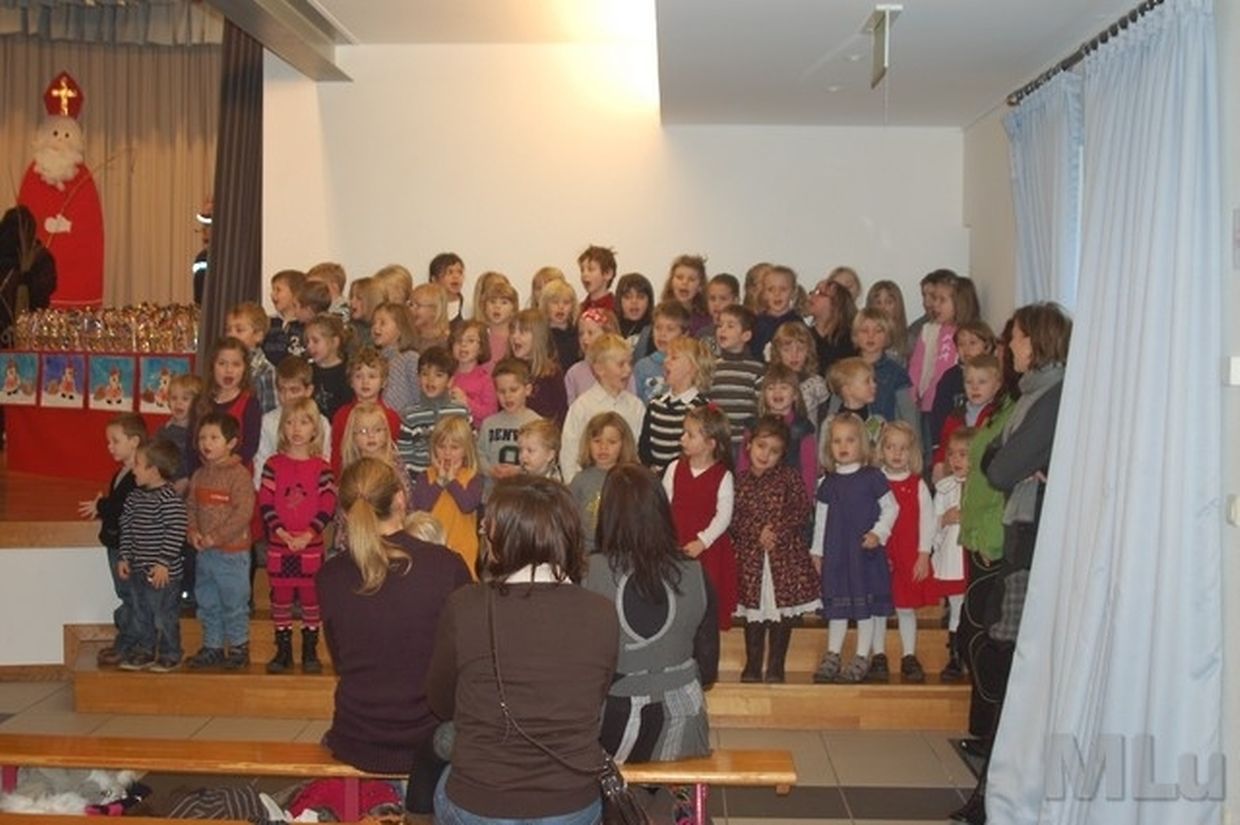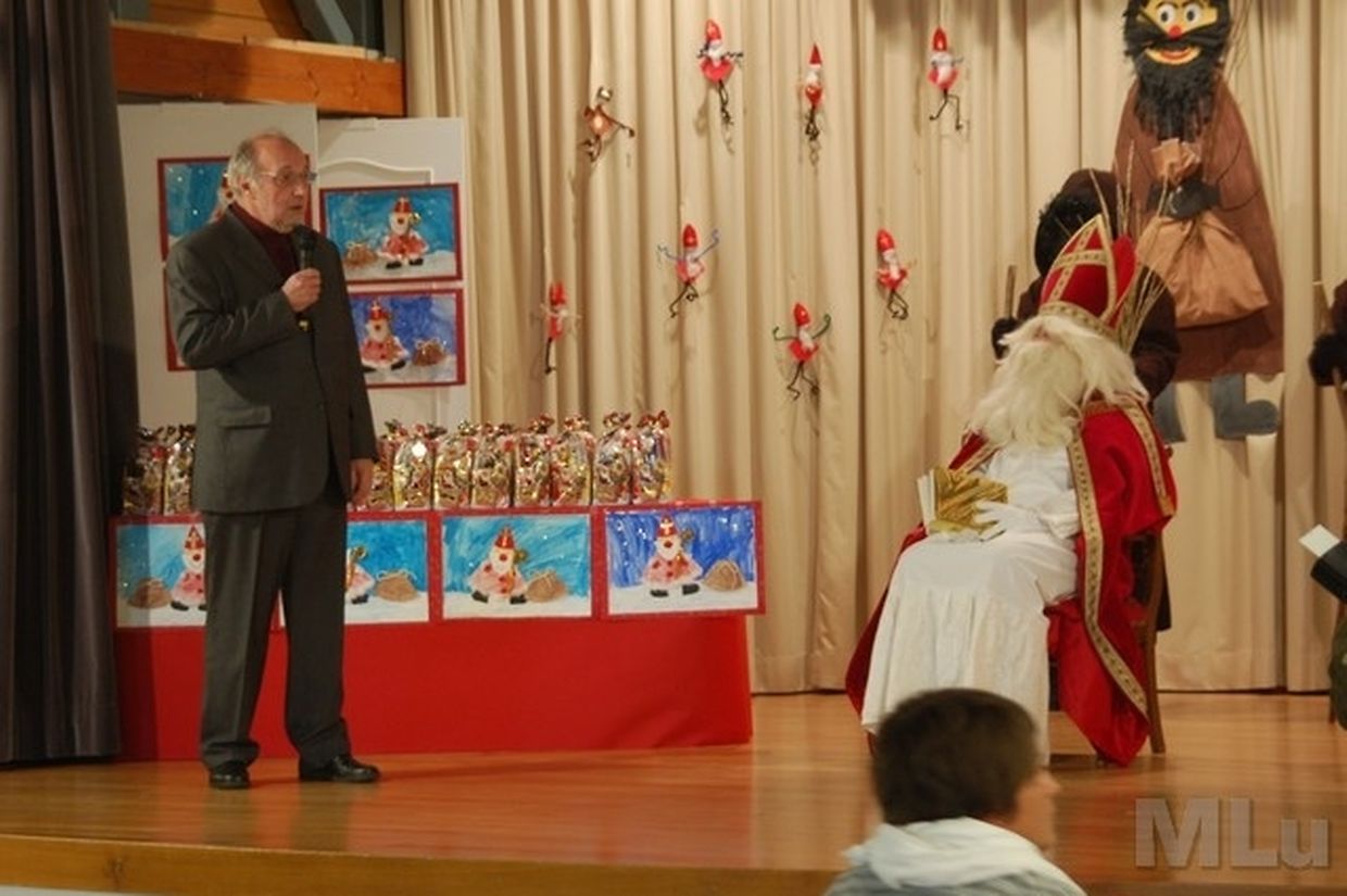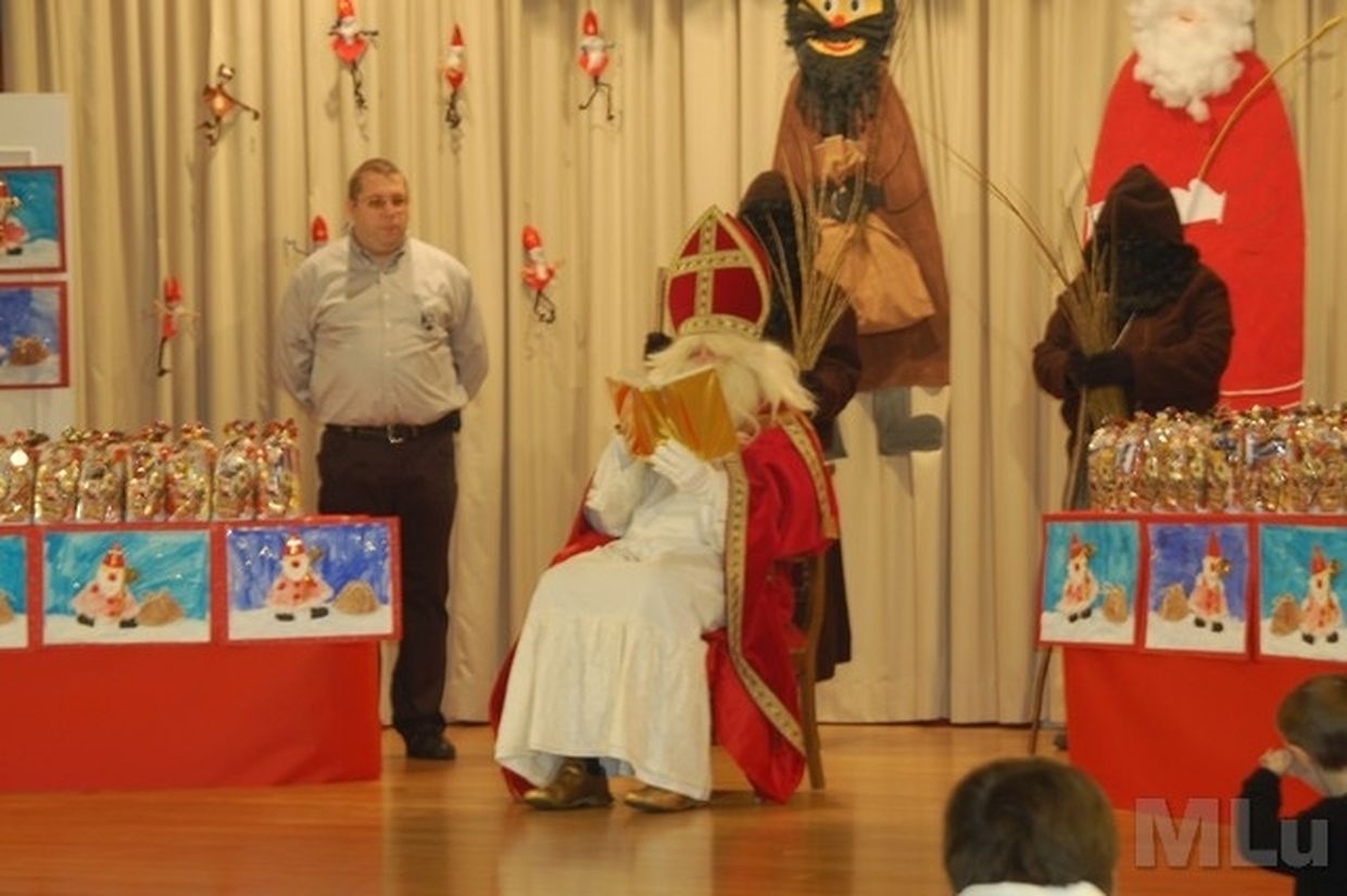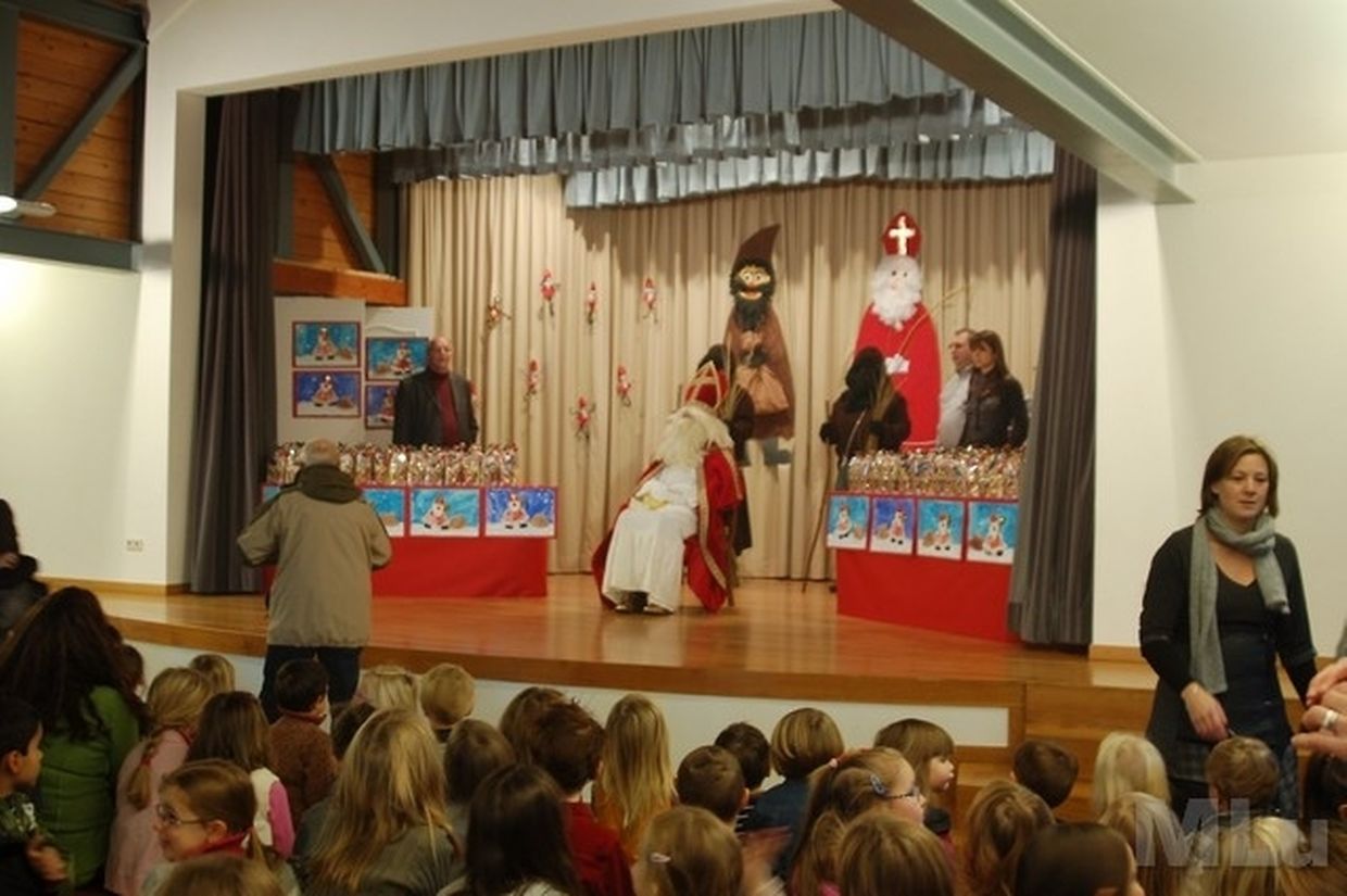 D'Schoulkanner haaten dem Kleeschen a séngen 2 Houséckergesellen ënnert der Lédung vum Schoulpersonnal e puer schéi Lidder gesongen a goufen, no dem Kleeschen sénger Ried, mat enger Tuut mat Schneeckegkéte belount.