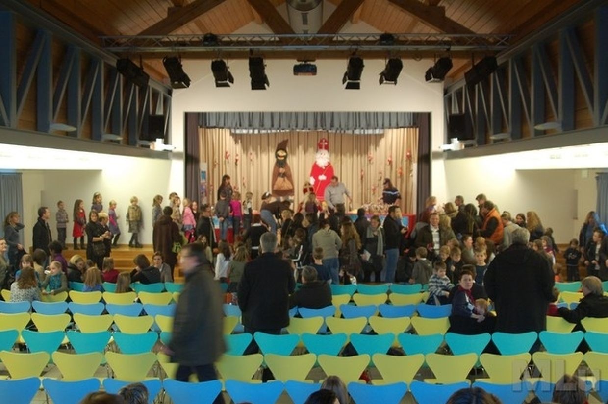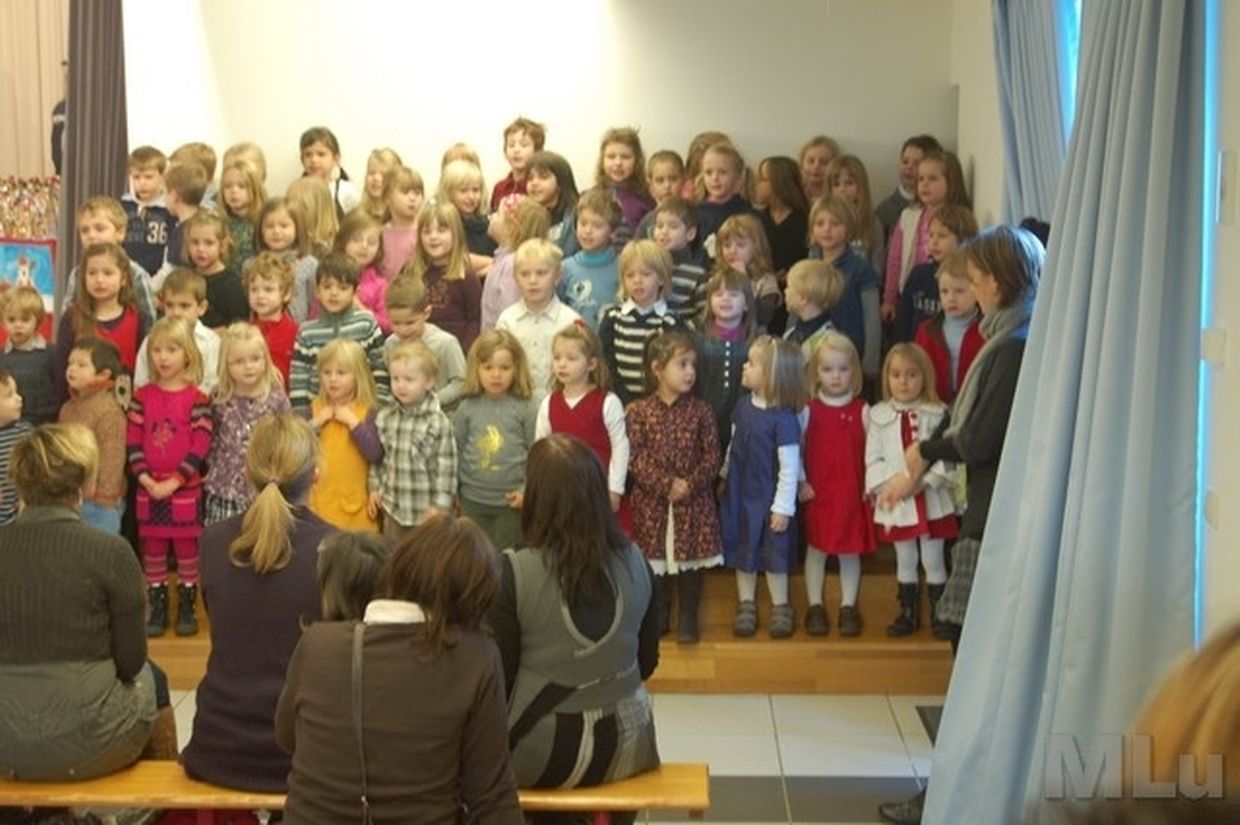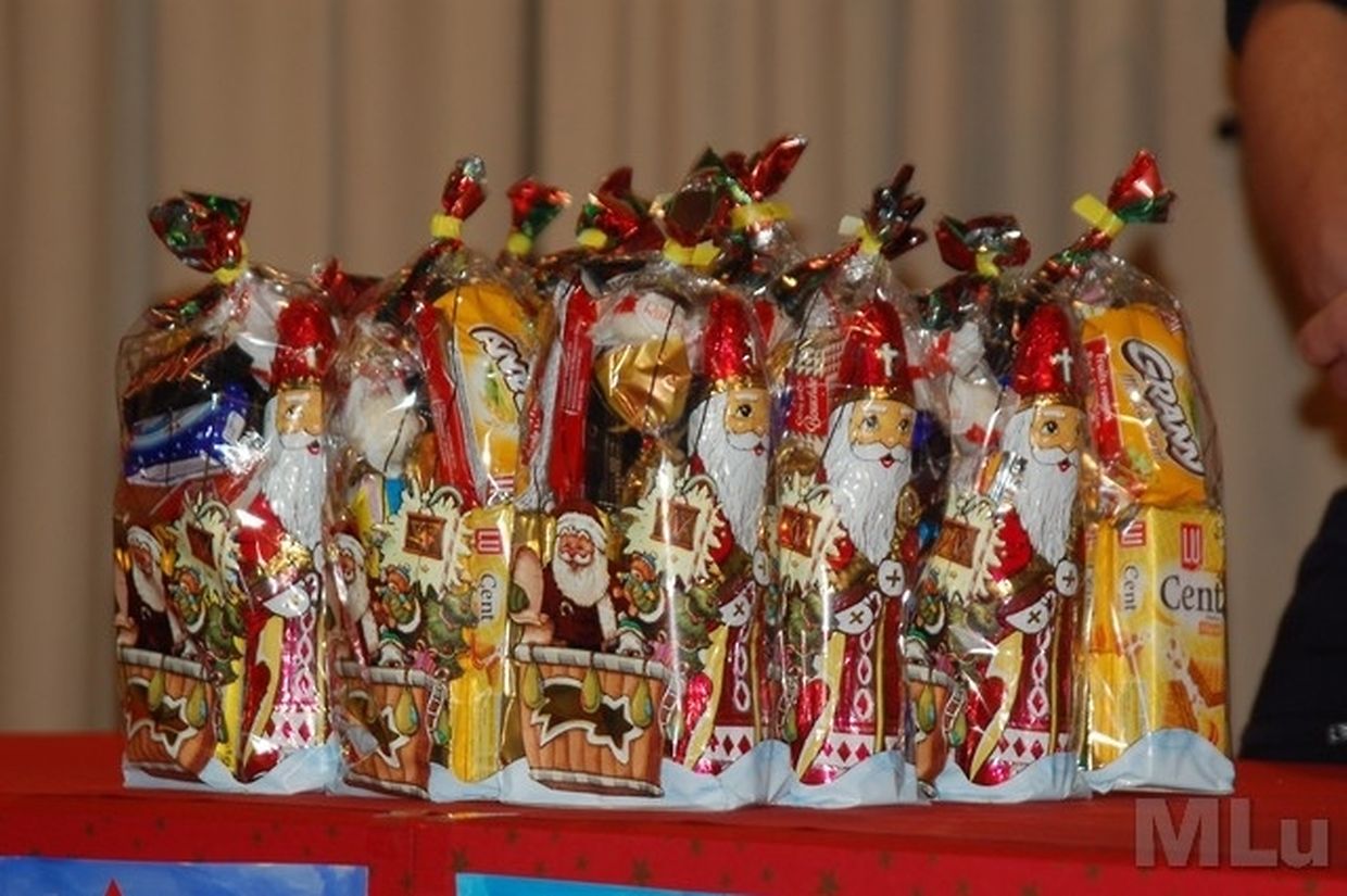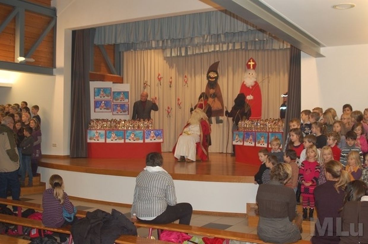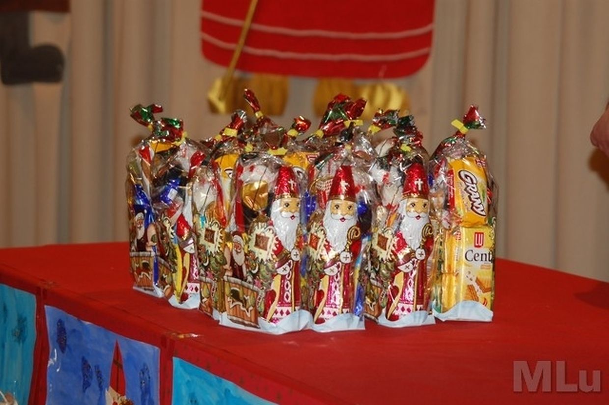 D'Schoulkanner haaten dem Kleeschen a séngen 2 Houséckergesellen ënnert der Lédung vum Schoulpersonnal e puer schéi Lidder gesongen a goufen, no dem Kleeschen sénger Ried, mat enger Tuut mat Schneeckegkéte belount.