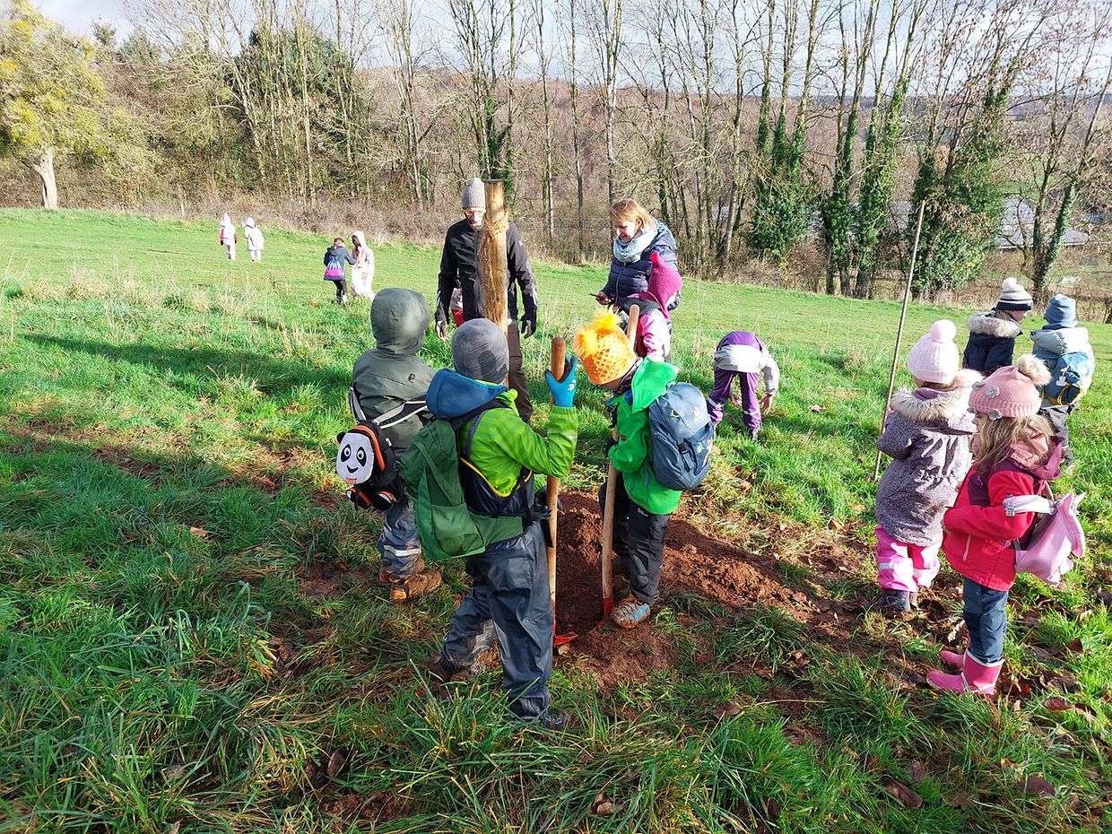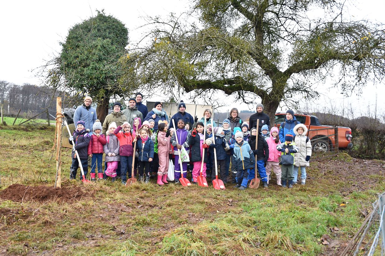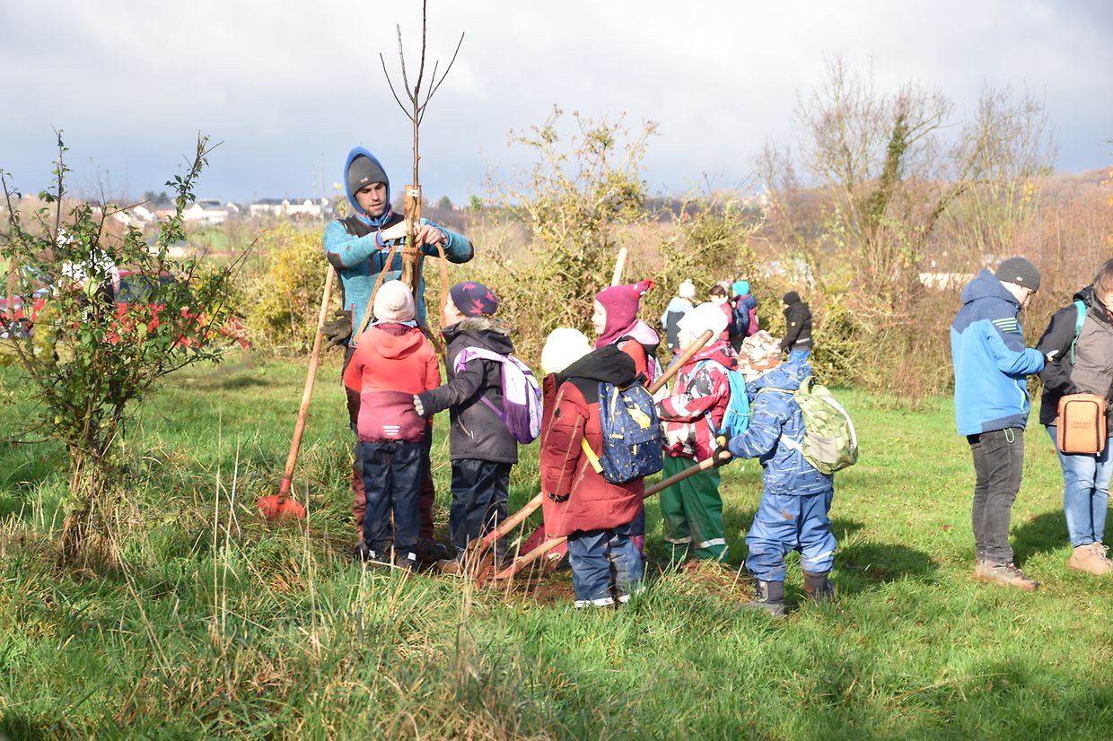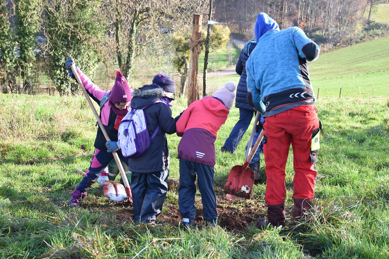 D‘Schüler aus der Primärschoul hunn uerdentlech mat ugepak bei der Bamplanzaktioun zu Lannen an der Gemeng Réiden/Atert. Déi eng hunn d’Lach gegruewen an déi aner de Bam gesat. Mat dëser Aktioun gëtt de Kanner gewisen, wéi vill Aarbecht dohannert stécht an datt d’Erhale vun de Bongerte wichteg ass fir haut an d’Zukunft.