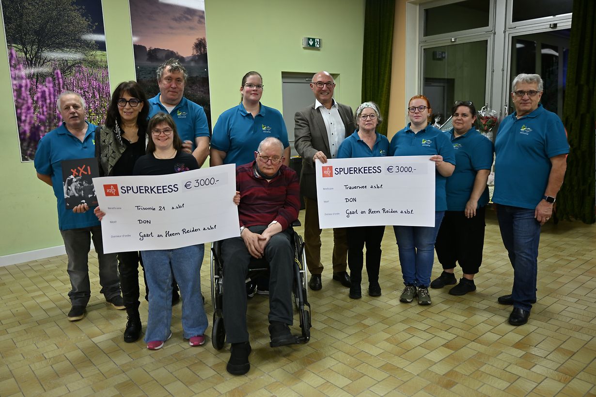 Réiden/Atert: De Gaart an Heem Réiden/Atert hat am November op hiren traditionnelen Hierkenowend an den Hal Polyvalent invitéiert, den och musikalisch begleet, vum Duo Wa Ta Touille e ganz groussen Erfolleg kannt huet. No senge Wierder vu Wëllkomm a Merci vum President Raymond Schlim koum et dunn zesummen mam Virstand, zu enger duebeler Scheckiwerreechung, déi den Erléis vum Verkaaf vun Eisekuchen iwert dat ganzt Joer duerstellt. Mat oprichtigen Merci konnt Madame Martine Eischen, Presidentin vun der Vereenegung „Trisomie 21“ e Scheck vun 3 000 Euro entgéint huelen. E weidere Scheck vun 3 000 Euro huet den Max Zuccoli, Sekretär vun der Vereenegung „Trauerwee“ mat Freed an Empfang geholl. Duerno hu béid Scheckempfänger hir jeweilig Vereenegung ouni Gewënnzweck och kuurz virgestallt an matgedeelt wéi dess Spenden och wirkungsvoll agesaat gin. (Foto: Charles Reiser)