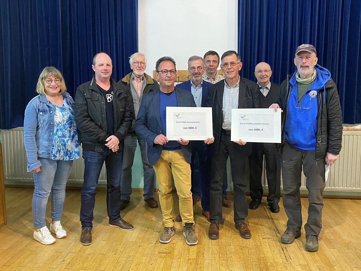 Über eine finanzielle Unterstützung von 3000€ durfte sich Raoul Schaaf, Direktor der Vereinigung „CNDS-Naturarbechten“ freuen. Des Weiteren wurde ein Scheck von 5000€, an Jim Schmitz, Vertreter der Vereinigung „Hëllef fir d’Natur“ überreicht. Beide Vertreter gaben den Anwesenden Erklärungen zur Arbeit ihrer Vereinigungen sowie zur Verwendung der Spenden .