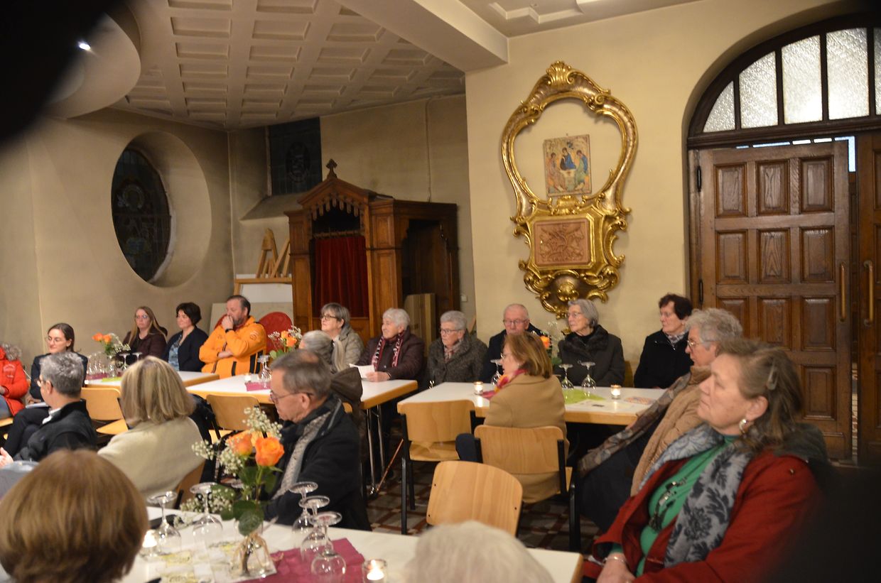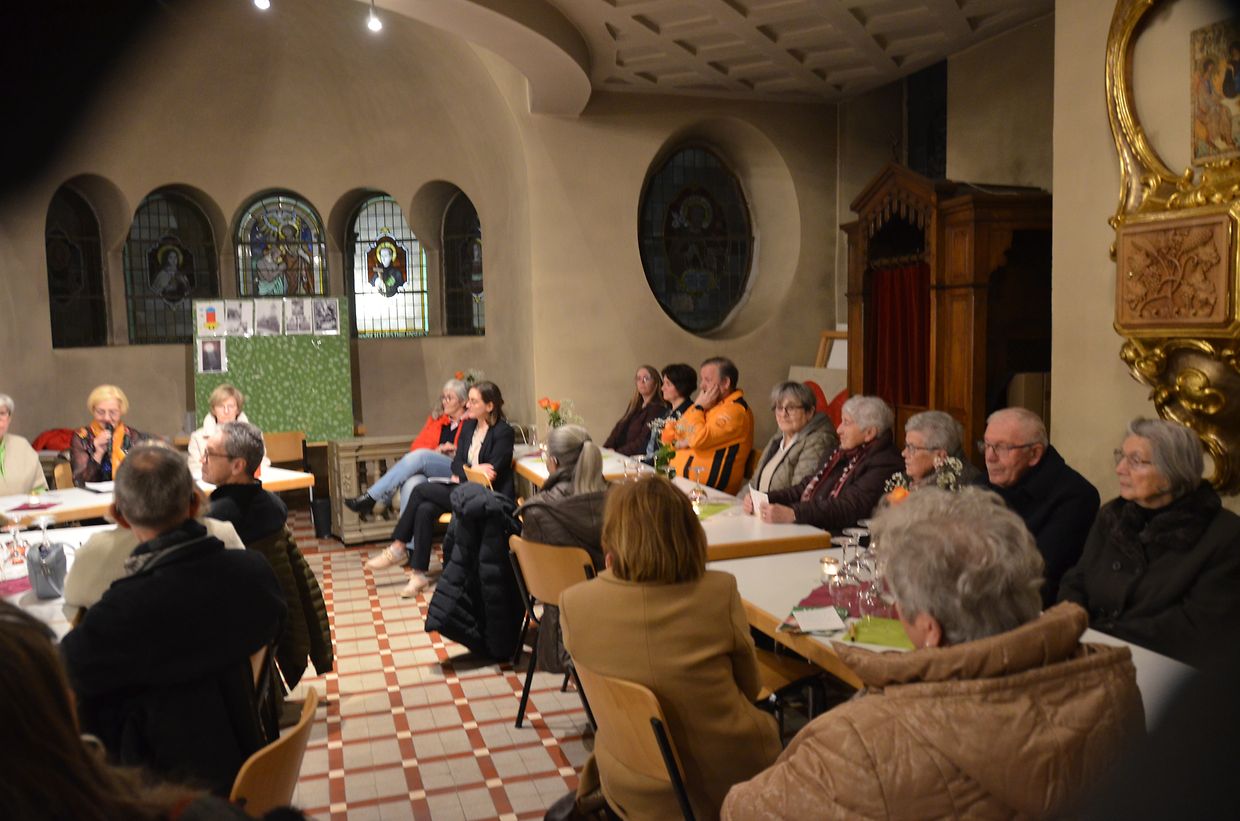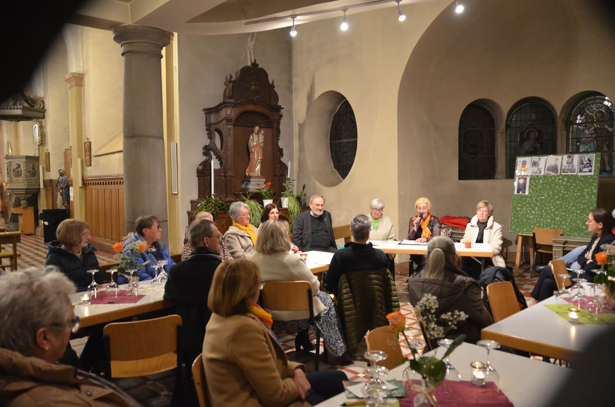 D’Presidentin Martine Lallemand huet d’Invitéë begréisst; vun der Gemeng de Schäffe Jeff Lisarelli, d’Madamm Monique Kuffer d’Madamm Marie-Claire Rasqué Presidentin vun de Fraen a Mamme Par Atertdall Sainte-Claire an Dekanatsvertriederin vum Dekanat Zentrum, d’Éierepresidentin d’Madamm Rosa Pletschette-Wolter, d’Madamm Liliane Loos-Magar aus dem Zentralkommitee vun der ACFL, d’Madamm Rachel Braun Vertriederin vun Hëllef um Terrain, d’Vertrieder vum Nidderpallener Gesank, esou wéi den Här Deche Jean-Jacques Flammang S.C.J.