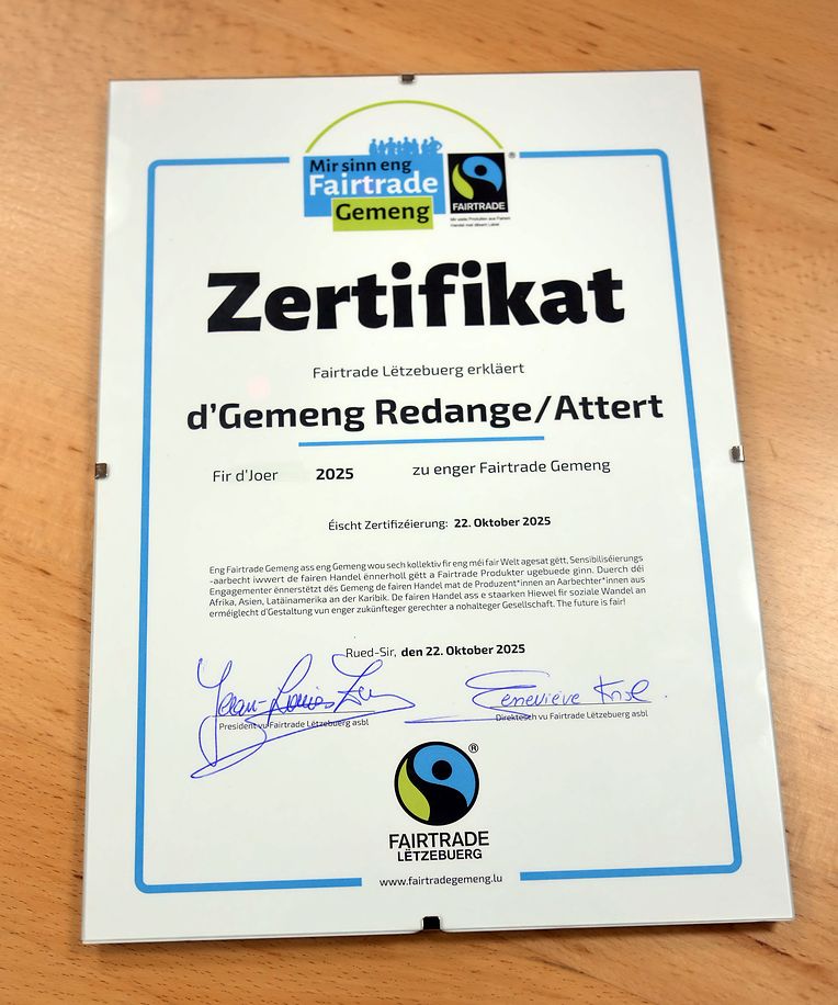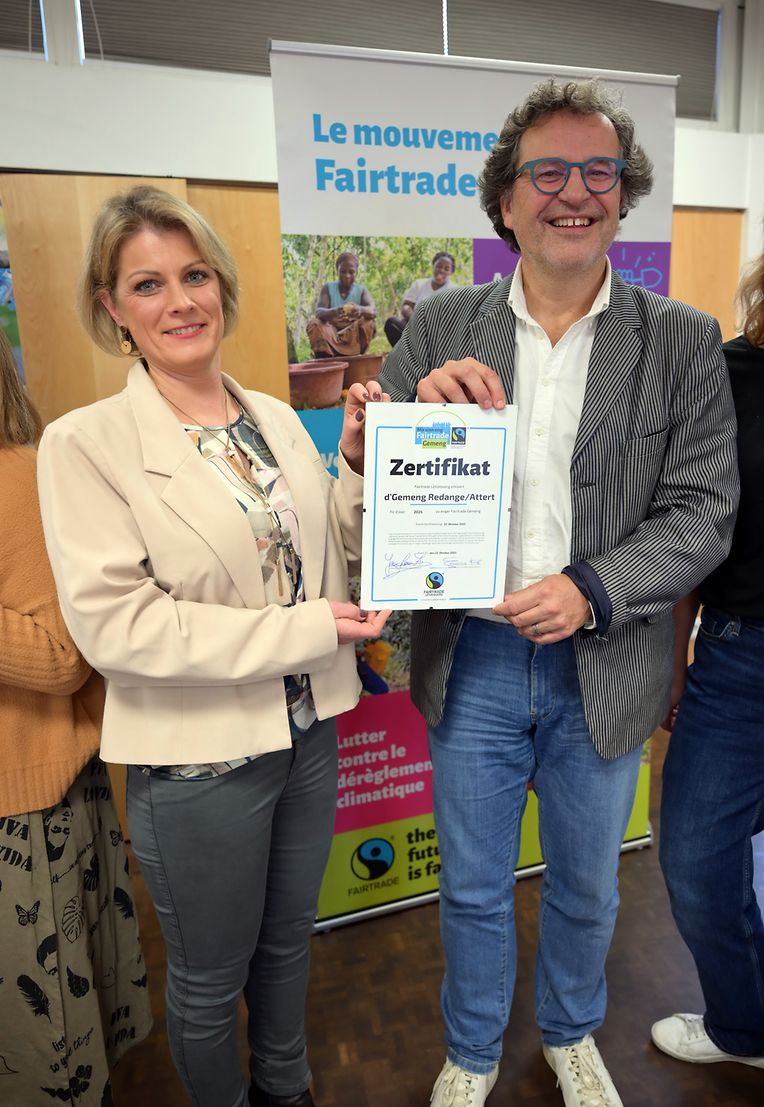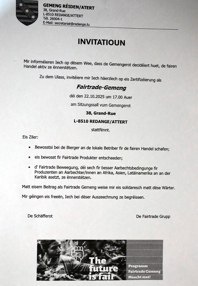 De Kanton Réiden huet eng nei Fairtrade Gemeng! Den 22. Oktober krut Réiden-op-der-Atert de Fairtrade Gemeng Zertifikat iwwerreecht an trëtt esou dem weltwäite Reseau vun de Fairtrade Towns bäi. Zu Lëtzebuerg ginn et elo, mat Réiden, schonn 39 Gemengen déi sech fir de fairen Handel aktiv asëtzen, a weltwäit iwwer 2200.
