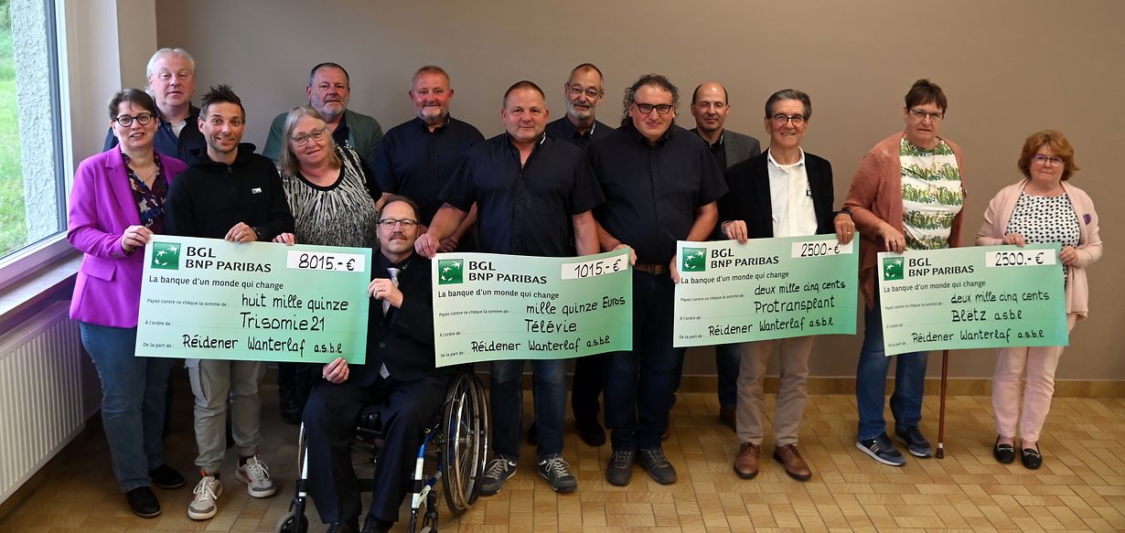 Zum Schluss vun der Versammlung war traditiounsgeméiss eng véier- Fach Scheckiwerrreechung am Gesamtwert vun ëmmerhin 14.030 Euro, déi en Deel vun de Recetten vum Wanterlaf 2023 duerstellen. E Scheck vun 8 015 Euro konnten de Claude Weber, d’Sylvia Kieffer an d‘Jeanne Zuidberg entgéint huelen, déi, der Vereenegung „Trisomie 21“ zugut kommen. E weidere Scheck vun 2 500 Euro, den fir „Protransplant“ bestëmmt ass, duefir huet de Fernand Kneip sech gefreet. D‘ Nicole Backes a Vertriedung vun der Associatioun“ Blëtz“ huet fir de Scheck vun 2 500 Euro, Merci gesoot. Weider 1 015 Euro waren am Virfeld schon fir „Télévie“ iwerwisse gin. Nodeems dat sämtlich Scheckempfänger hir Vereenegungen mat hiren respektiven Aktivitéiten a Projeten, verbonnen mat engem grousse Merci virgestallt hun, huet dess Versammlung hiren würdigen Ofschloss fond. (CR) (Foto: Charles Reiser)