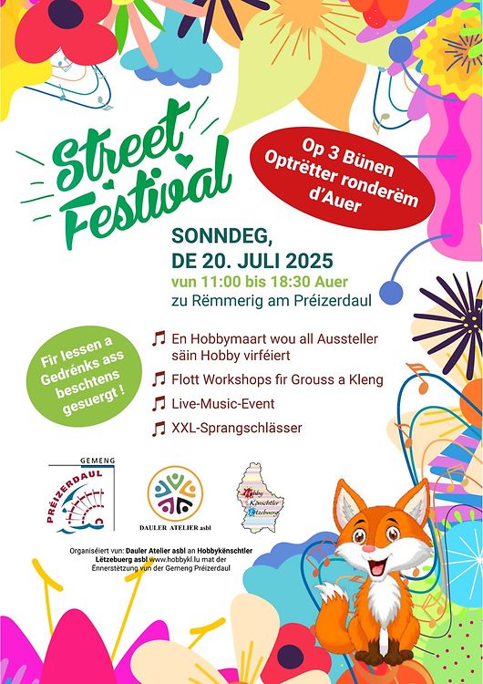 Zousätzlech gëtt et op dësem Street Festival Live-Musek op dräi Bünen ugebueden.
