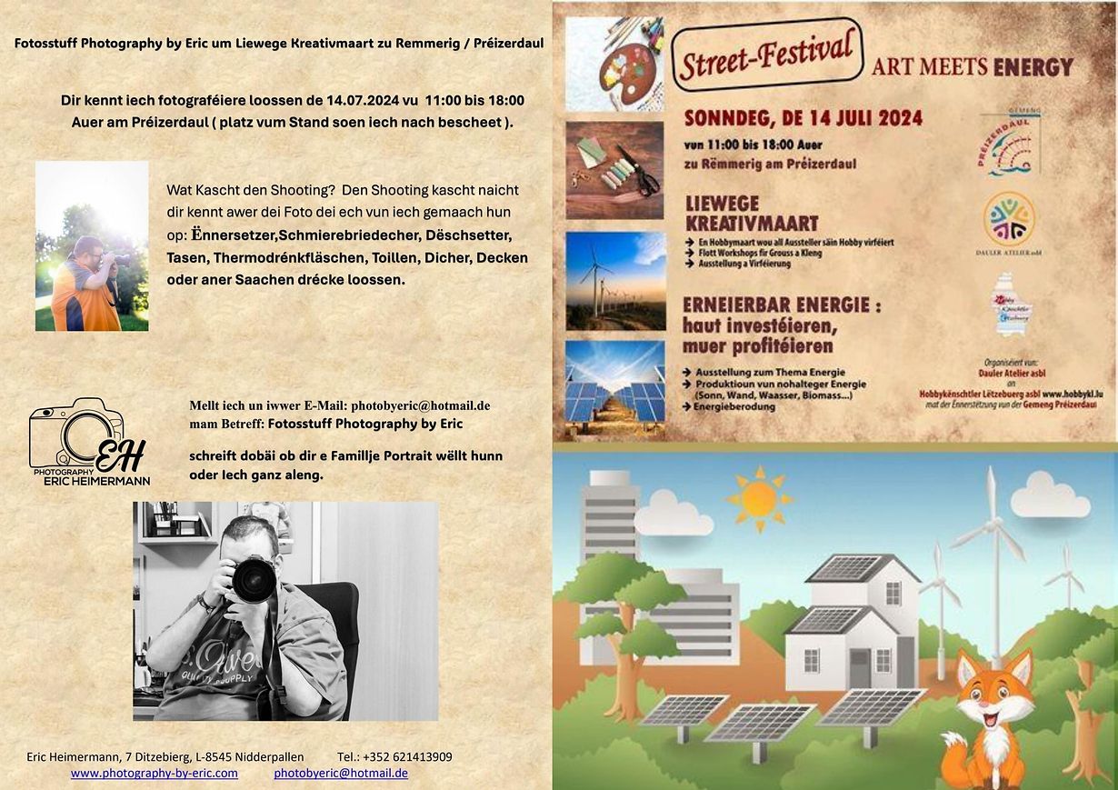 Reimberg Fotosstuff Photography by Eric um Liewege Kreativmaart zu Remmerig /Préizerdaul Eric Heimermann Veröffentlicht am Mittwoch, 10. April 2024 um 11:07 Reimberg Préizerdaul, Luxemburg Hallo, Ech Stellen de 14. Juli am Préizerdaul aus an hunn do e Projet fir wou ech Leit Fotograféieren e Weder Familljefotoen oder Portrait Fotografie wann dir intresséiert sidd da mellt iech iwwer E-mail mei infos um Flyer Unpassenden Inhalt angeben Weitere Neuigkeiten von Eric Heimermann > den Nidderpallener Gesank hat hiert Merciiessen mat schéck iwwerrechung 11.11.24 Redingen Eng schéi Muttergottesfeier zu Nidderpallen 19.08.24 Niederpallen Muttergottesfeier op dem 15. August zu Rippweiler 19.08.24 Rippweiler Schwaarz Schwanen 12.08.24 Heisdorf (Steinsel) Helleger Klara, d'Patréinesch vun der Par Atertdall Sainte-Claire. 12.08.24 Redingen