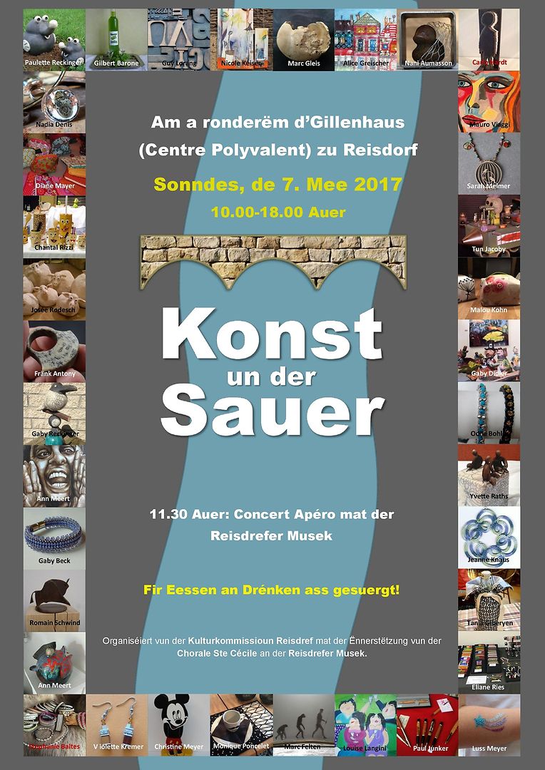 De 7. Mee 2017 vun 10 bis 18 Auer invitéiere mir Iech all op Reisduerf fir di 2. Editioun vun "KONST UN DER SAUER" - organiséiert vun der Reisdrëfer Kulturkommissioun mat Ënnerstëtzung vun der Chorale Ste. Cécile an der Reisdrëfer Musek a.s.b.l. - am a ronderëm d’Gillenhaus (Centre Polyvalent) zu Reisduerf.
