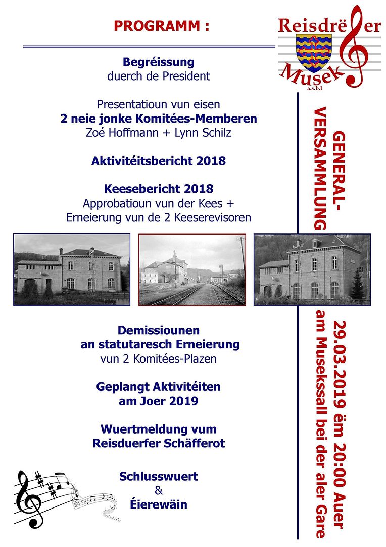Die am 29. März 2019 erstmals im Musiksaal bei der „aler Reisdrëfer Gare“ abgehaltene 7. ordentliche Generalversammlung der Reisdrëfer Musek a.s.b.l. stand ganz im Zeichen von Verjüngung, Abschied und neuen Ideen.