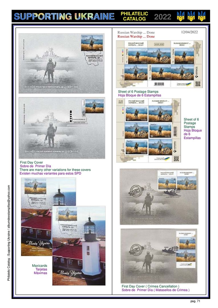 If you are interested in stamps on the subject of " supporting Ukraine with stamps ", you can't miss this cracking new SUPPORTING UKRAINE PHILALETIC CATALOGUE 2022 by Juan Carlos Delgado Málaga from Peru on Facebook at : https://www.ukraine-war-in-philately.eu/media SUPPORTING%20UKRAINE%20PHILATELY.pdf?fbclid=IwAR3fyBnA7z9mDgVNB5vbsN-BDFcZ3CjstOH877UhmvYwwZ2ty9_ml61hWKI or at http://www.ukraine-war-in-philately.eu.