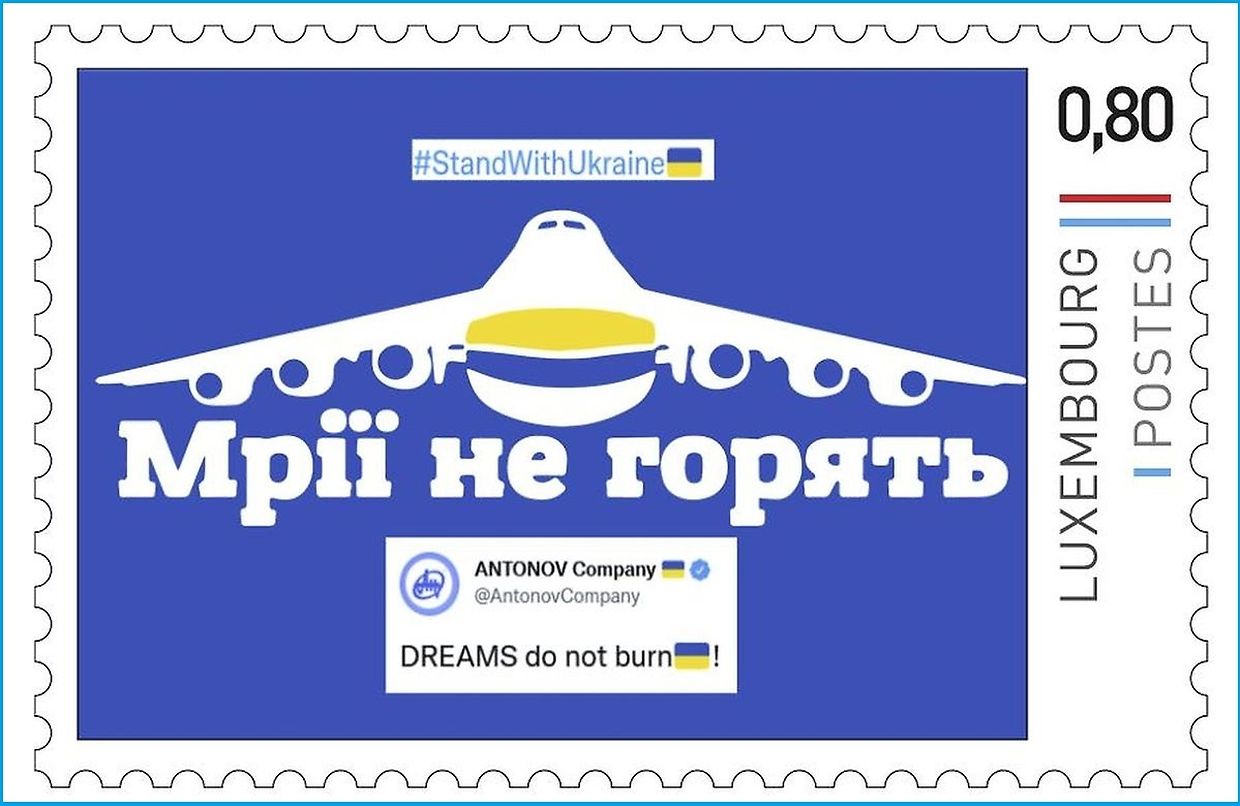 * on page 39 the two special stamps "Dreams-do-not-burn", which were designed completely privately - and can still be ordered - with the logo of the unique and unfortunately totally destroyed Antonov AN-225 Mrija, which has become the symbol of Ukrainian national pride and will possibly be redeveloped by an international aid fund after the end of the war.