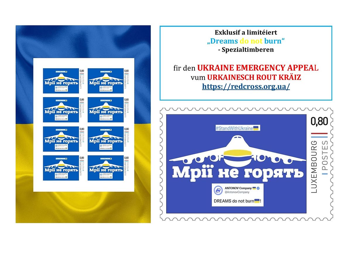 If you still want to order one of the few last copies of these very limited "Dreams-do-not-burn" special stamps, you can easily do so by sending a simple request via email to dreams-do-not-burn@outlook.com : https://www.wort.lu/de/mywort/reisdorf/news/dreams-do-not-burn-briefmarken-fuer-ukraine-emergency-appeal-ukrainian-red-cross-62d86107de135b9236777f2a.