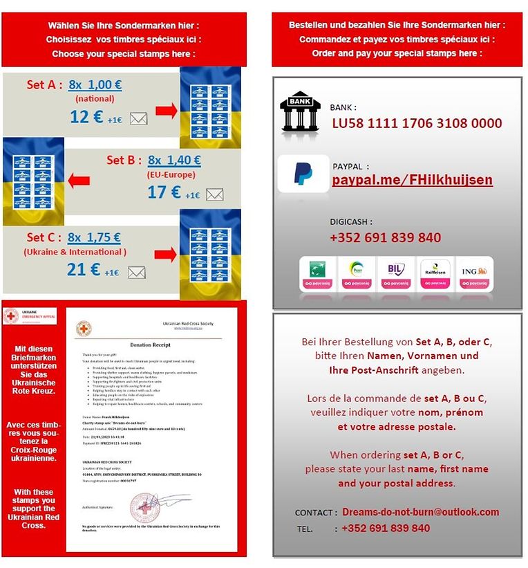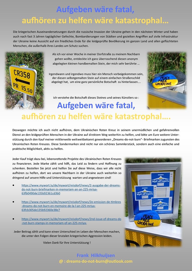 Deswegen möchte ich auch nicht aufhören, dem Ukrainischen Roten Kreuz in seinem unermüdlichen und gefahrenvollen Dienst an den leidgeprüften Menschen in der Ukraine auf direktem Weg weiterhin zu helfen, und bitte um Eure weitere Unterstützung durch den Kauf meiner mittlerweile weltweitbekannt gewordenen „Dreams-do-not-burn“- Briefmarken zugunsten des Ukrainischen Roten Kreuzes.