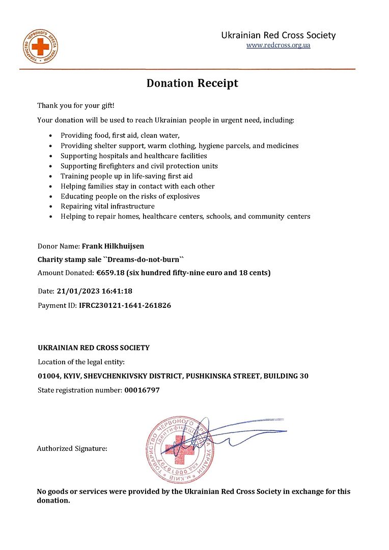 Aus dem karitativen Verkauf dieser limitierten und sehr exklusiven Sonderbriefmarken konnte im Verlauf von 6 Monaten eine erste beachtliche Spendesumme angehäuft und dann am 21. Januar 2023 offiziel an das Ukrainische Rote Kreuz überwiesen werden :